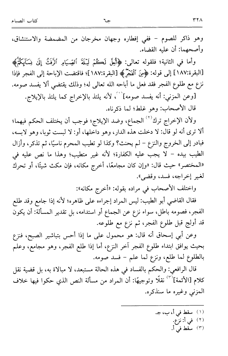 وعن أبي إسحاق أنه قال: هو محمول على ما إذا أحس بتباشير الصبح، فنزع بحيث يوافق ابتداء طلوع الفجر آخر النزع، أما إذا طلع الفجر، وهو مجامع، وعلم بالطلوع لما طلع، ونزع لما علم – فسد صومه.
