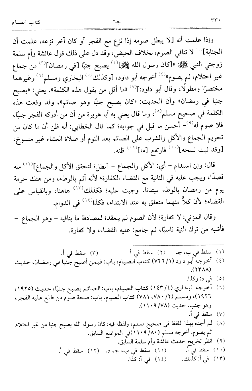 وإذا علمت أنه [لا يبطل صومه إذا نزع مع الفجر أو كان آخر نزعه، علمت أن الجنابة] لا تنافي الصوم، بخلاف الحيض، وقد دل على ذلك قول عائشة وأم سلمة زوجتي النبي صلى الله عليه وسلم: " [كان رسول الله صلى الله عليه وسلم] يصبح جنباً [في رمضان] من جماع غير احتلام، ثم يصوم" أخرجه أبو داود، [وكذلك البخاري ومسلم وغيرهما مختصراً ومطولاً، وقال أبو داود:] "ما أقل من يقول هذه الكلمة"، يعني: "يصبح جنباً في رمضان" وأن الحديث: "كان يصبح جنباً وهو صائم"، وقد وقعت هذه الكلمة في صحيح مسلم، وما قال يعني به أبا هريرة من أن من أدركه الفجر جنباً، فلا صوم له – أحسن ما قيل في جوابه؛ كما قال الخطابي: أنه ظن أن ما كان من تحريم الجماع والأكل والشرب على الصائم بعد النوم أو صلاة العشاء غير منسوخ، [وقد ثبت نسخه] فارتفع [ما] ظنه.