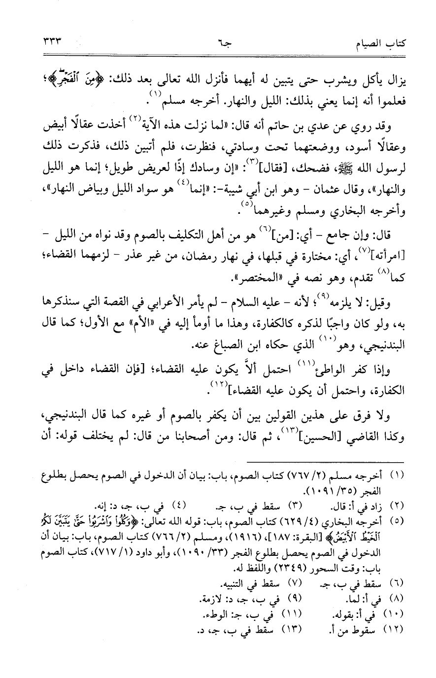 وقد روي عن عدي بن حاتم أنه قال: "لما نزلت هذه الآية أخذت عقالاً أبيض وعقالاً أسود، ووضعتهما تحت وسادتي، فنظرت، فلم أتبين ذلك، فذكرت ذلك لرسول الله صلى الله عليه وسلم، فضحك، [فقال]: "إن وسادك إذاً لعريض طويل؛ إنما هو الليل والنهار"، وقال عثمان -وهو ابن أبي شيبة -:"إنما هو سواد الليل وبياض النهار"، وأخرجه البخاري ومسلم وغيرهما.