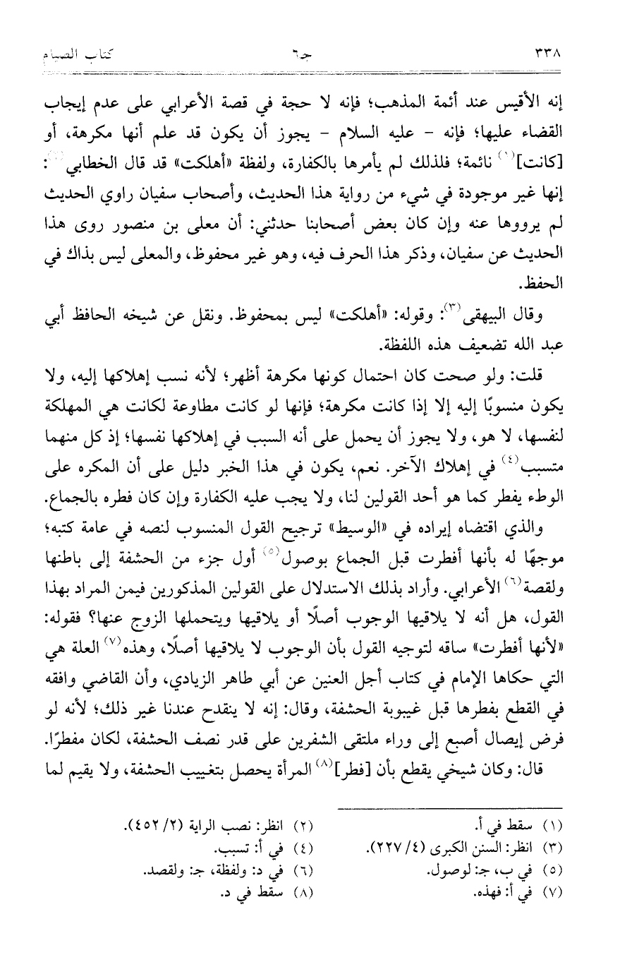 قلت: ولو صحت كان احتمال كونها مكرهة أظهر؛ لأنه نسب إهلاكها إليه، ولا يكون منسوباً إليه إلا إذا كانت مكرهة؛ فإنها لو كانت مطاوعة لكانت هي المهلكة لنفسها، لا هو، ولايجوز أن يحمل على أنه السبب في إهلاكها نفسها؛ إذ كل منهما متسبب في إهلاك الآخر. نعم، يكون في هذا الخبر دليل على أن المكره على الوطء يفطر كما هو أحد القولين لنا، ولا يجب عليه الكفارة وإن كان فطره بالجماع.