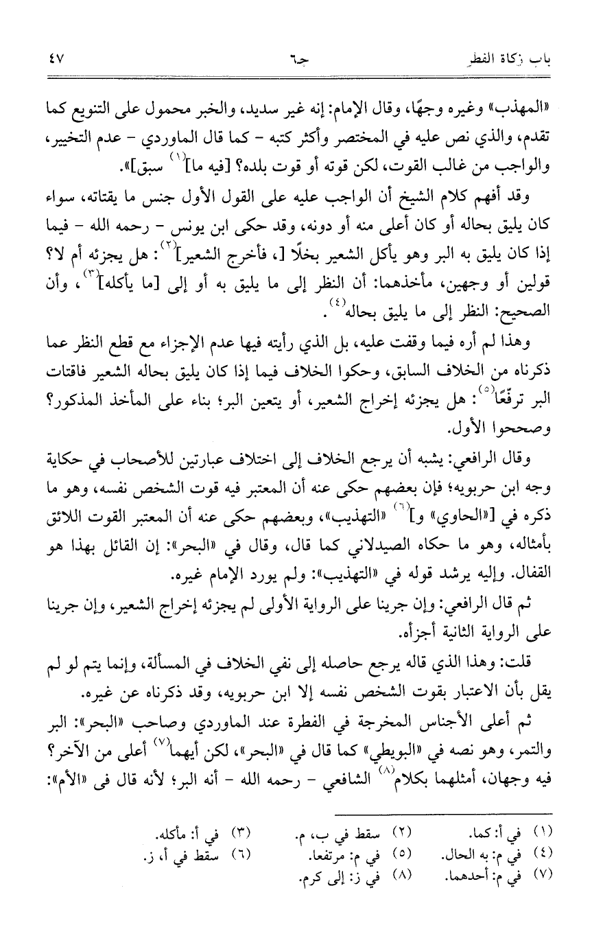وقال الرافعي: يشبه أن يرجع الخلاف إلى اختلاف عبارتين للأصحاب في حكاية وجه ابن حربويه؛ فإن بعضهم حكى عنه أن المعتبر فيه قوت الشخص نفسه، وهو ما ذكره في ["الحاوي" و] "التهذيب"، وبعضهم حكى عنه أن المعتبر القوت اللائق بأمثاله، وهو ما حكاه الصيدلاني كما قال، وقال في "البحر": إن القائل بهذا هو القفال. وإليه يرشد قوله في "التهذيب": ولم يورد الإمام غيره.
