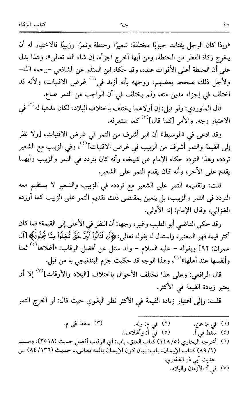 وقد حكى القاضي أبو الطيب وغيره وجهاً: أن النظر في الأعلى إلى القيمة؛ فما كان أكثر قيمة فهو المعتبر، واستدل له بقوله تعالى: {إِنَّمَا جَزَاءُ الَّذِينَ يُحَارِبُونَ اللَّهَ وَرَسُولَهُ} [آل عمران: 92] وبقوله – عليه السلام – وقد سئل عن أفضل الرقاب: "أغلاها ثمناً وأنفسها عند أهلها"، وهذا الوجه قد حكيت جزم البندنيجي به من قبل.