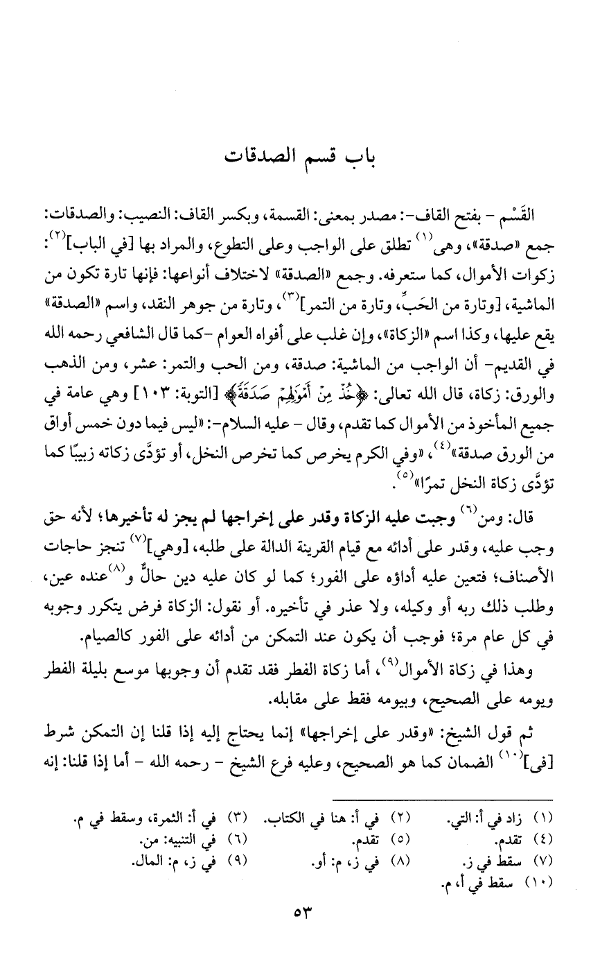 القَسْم - بفتح القاف-: مصدر بمعنى: القسمة، وبكسر القاف: النصيب: والصدقات: جمع "صدقة"، وهي تطلق على الواجب وعلى التطوع، والمراد بها [في الباب]: زكوات الأموال، كما ستعرفه. وجمع "الصدقة" لاختلاف أنواعها: فإنها تارة تكون من الماشية، [وتارة من الحَبِّ، وتارة من التمر]، وتارة من جوهر النقد، واسم "الصدقة" يقع عليها، وكذا اسم "الزكاة"، وإن غلب على أفواه العوام - كما قال الشافعي رحمه الله في القديم - أن الواجب من الماشية: صدقة، ومن الحب والتمر: عشر، ومن الذهب والورق: زكاة، قال الله تعالى: {خُذْ مِنْ أَمْوَالِهِمْ صَدَقَةً} [التوبة: 103] وهي عامة في جميع المأخوذ من الأموال كما تقدم، وقال - عليه السلام -:"ليس فيما دون خمس أواق من الورق صدقة"، "وفي الكرم يخرص كما تخرص النخل، أو تؤدَّى زكاته زبيباً كما تؤدَّى زكاة النخل تمراً".
