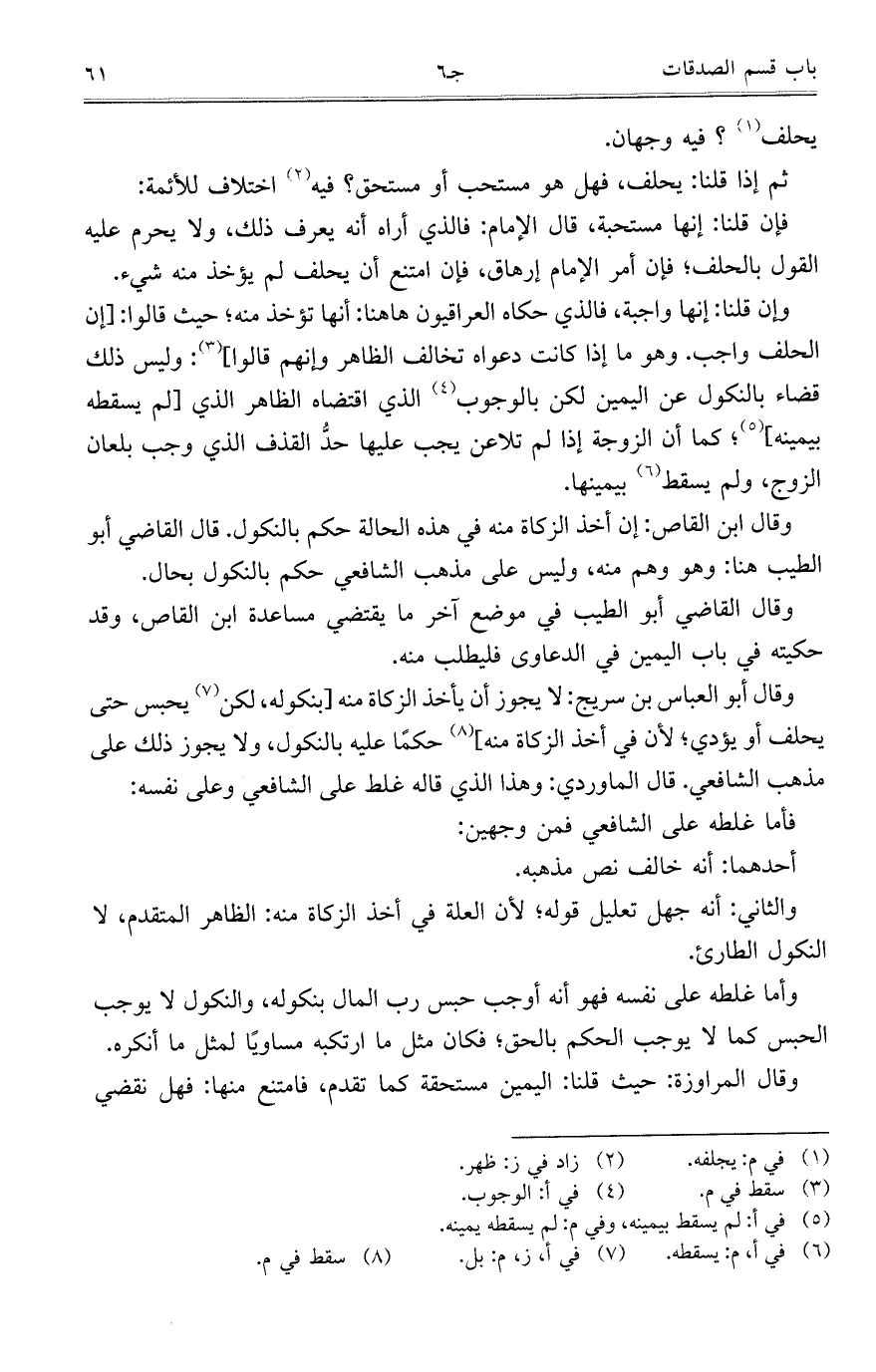 وقال ابن القاص: إن أخذ الزكاة منه في هذه الحالة حكم بالنكول. قال القاضي أبو الطيب هنا: وهو وهم منه، وليس على مذهب الشافعي حكم بالنكول بحال.