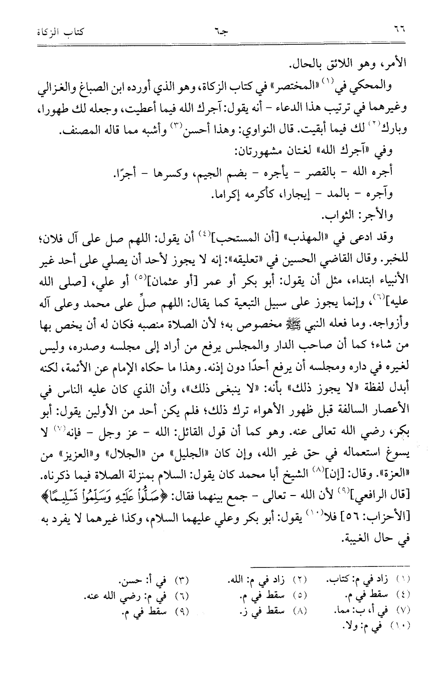 والمحكي في "المختصر" في كتاب الزكاة، وهوا لذي أورده ابن الصباغ والغزالي وغيرهما في ترتيب هذا الدعاء - أنه يقول: آجرك الله فيما أعطيت، وجعله لك طهورا، وبارك لك فيما أبقيت. قال النواوي: وهذا أحسن وأشبه مما قاله المصنف.