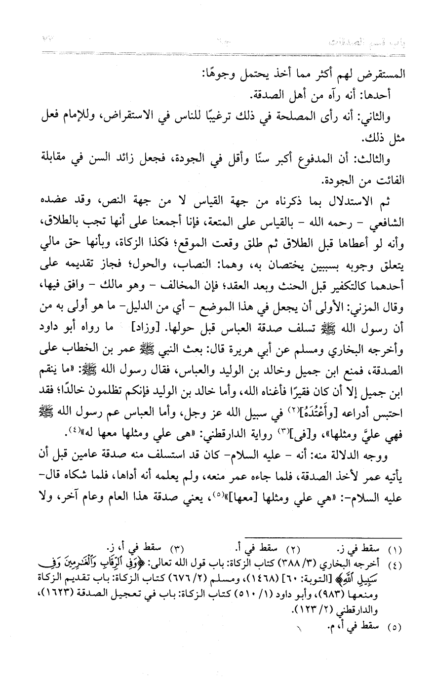 ووجه الدلالة منه: أنه – عليه السلام – كان قد استسلف منه صدقة عامين قبل أن يأتيه عمر لأخذ الصدقة، فلما جاءه عمر منعه، ولم يعلمه أنه أداها، فلما شكاه قال – عليه السلام -: "هي علي ومثلها [معها] "، يعني صدقة هذا العام وعام آخر، ولا