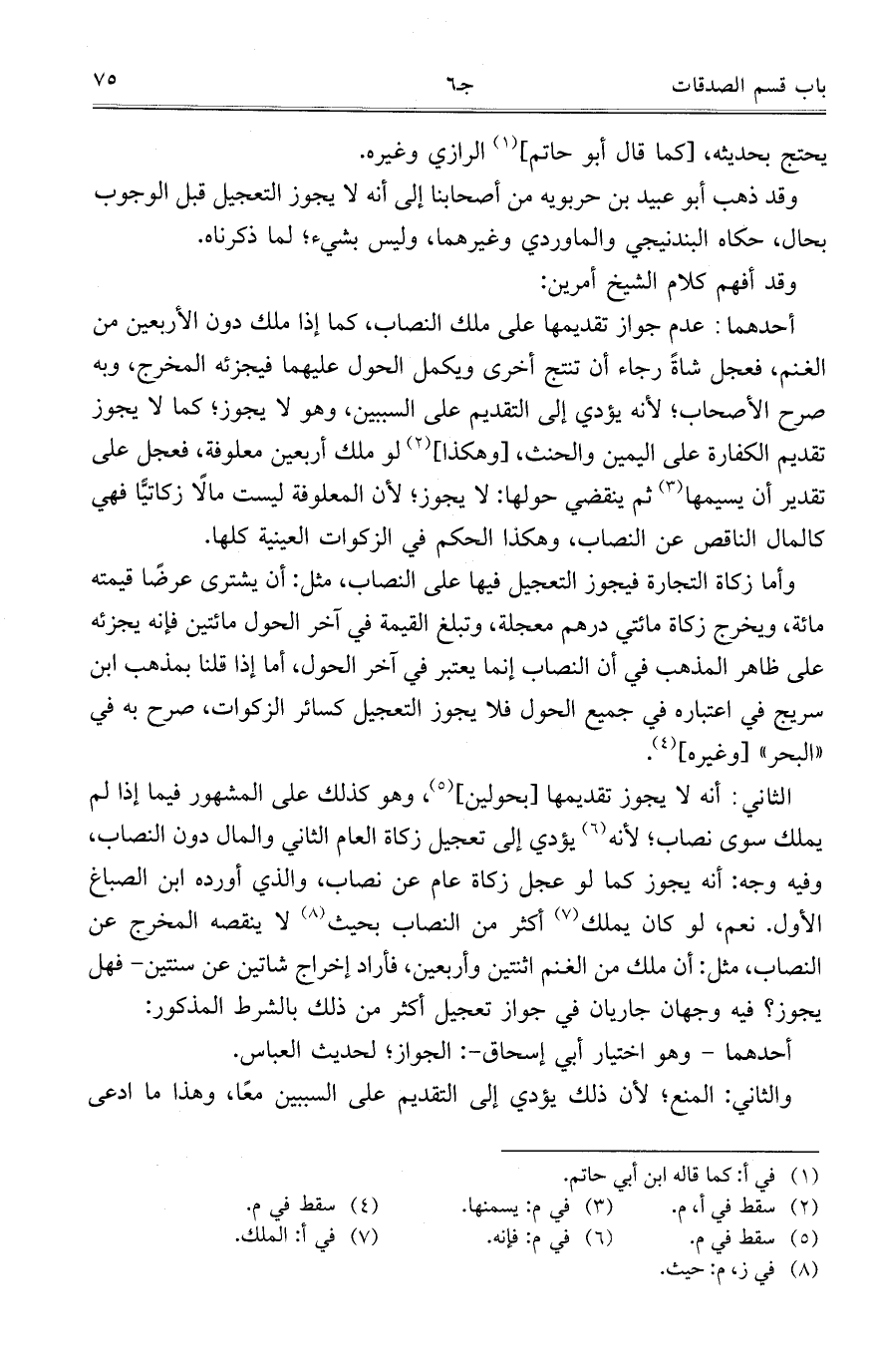 أحدهما: عدم جواز تقديمها على ملك النصاب، كما إذا ملك دون الأربعين من الغنم، فعجل شاةً رجاء أن تنتج أخرى ويكمل الحول عليهما فيجزئه المخرج، وبه صرح الأصحاب؛ لأنه يؤدي إلى التقديم على السببين، وهو لايجوز؛ كما لا يجوز تقديم الكفارة على اليمين والحنث، [وهكذا] لو ملك أربعين معلوفة، فعجل على تقدير أن يسيمها ثم ينقضي حولها: لا يجوز؛ لأن المعلوفة ليست مالاً زكاتياً فهي كالمال الناقص عن النصاب، وهكذا الحكم في الزكوات العينية كلها.