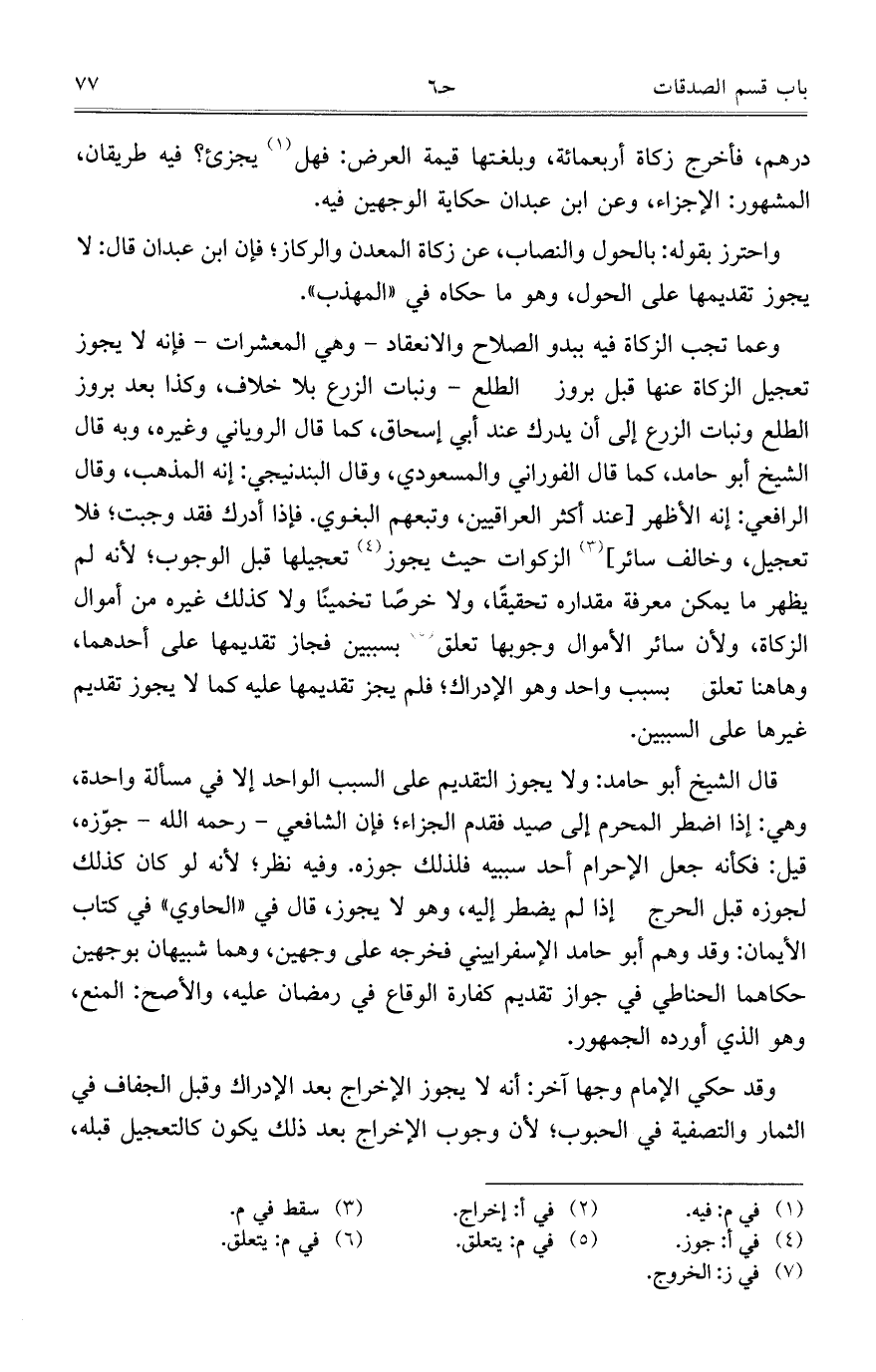 وعما تجب الزكاة فيه ببدو الصلاح والانعقاد - وهي المعشرات - فإنه لا يجوز تعجيل الزكاة عنها قبل بروز الطلع - ونبات الزرع بلا خلاف، وكذا بعد بروز الطلع ونبات الزرع إلى أن يدرك عند أبي إسحاق، كما قال الروياني وغيره، وبه قال الشيخ أبو حامد، كما قال الفوراني والمسعودي، وقال البندنيجي: إنه المذهب، وقال الرافعي: إنه الأظهر [عند أكثر العراقيين، وتبعهم البغوي. فإذا أدرك فقد وجبت؛ فلا تعجيل، وخالف سائر] الزكوات حيث يجوز تعجيلها قبل الوجوب؛ لأنه لم يظهر ما يمكن معرفة مقداره تحقيقاً، ولا خرصاً تخميناً ولا كذلك غيره من أموال الزكاة، ولأن سائر الأموال وجوبها تعلق بسببين فجاز تقديمها على أحدهما، وهاهنا تعلق بسبب واحد وهو الإدراك؛ فلم يجز تقديمها عليه كما لا يجوز تقديم غيرها على السببين.