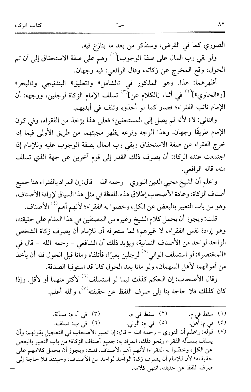 قلت: ويجوز أن يحمل كلام الشيخ وغيره من المصنفين في هذا المقام على حقيقته، وهو إرادة نفس الفقراء، لا غيرهم؛ لما ستعرفه أن للإمام أن يصرف زكاة الشخص الواحد لواحد من الأصناف الثمانية، ويؤيد ذلك أن الشافعي – رحمه الله – قال في "المختصر": لو استسلف الوالي لرجلين بعيراً، فأتلفاه وماتا قبل الحول فله أن يأخذ من أموالهما لأهل السهمان، ولو ماتا بعد الحول كانا قد استوفيا الصدقة.