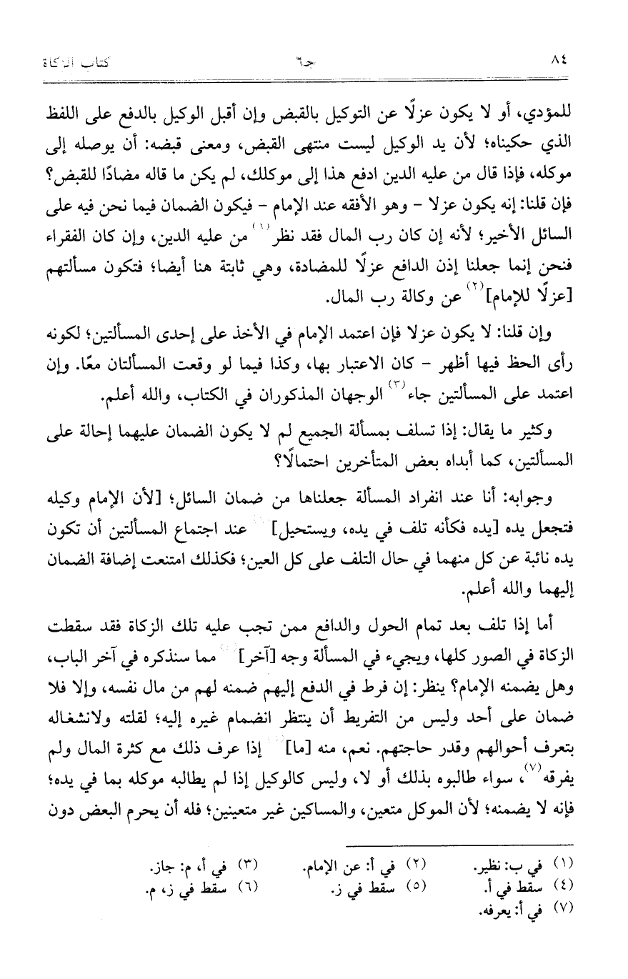 أما إذا تلف بعد تمام الحول والدافع ممن تجب عليه تلك الزكاة فقد سقطت الزكاة في الصور كلها، ويجيء في المسألة وجه [آخر] مماسنذكره في آخر الباب، وهل يضمنه الإمام؟ ينظر: إن فرط في الدفع إليهم ضمنه لهم من مال نفسه، وإلا فلا ضمان على أحد وليس من التفريط أن ينتظر انضمام غيره إليه؛ لقلته ولانشغاله بتعرف أحوالهم وقدر حاجتهم. نعم، منه [ما] إذا عرف ذلك مع كثرة المال ولم يفرقه، سواء طالبوه بذلك أو لا، وليس كالوكيل إذا لم يطالبه موكله بما في يده؛ فإنه لا يضمنه؛ لأن الموكل متعين، والمساكين غير متعينين؛ فله أن يحرم البعض دون