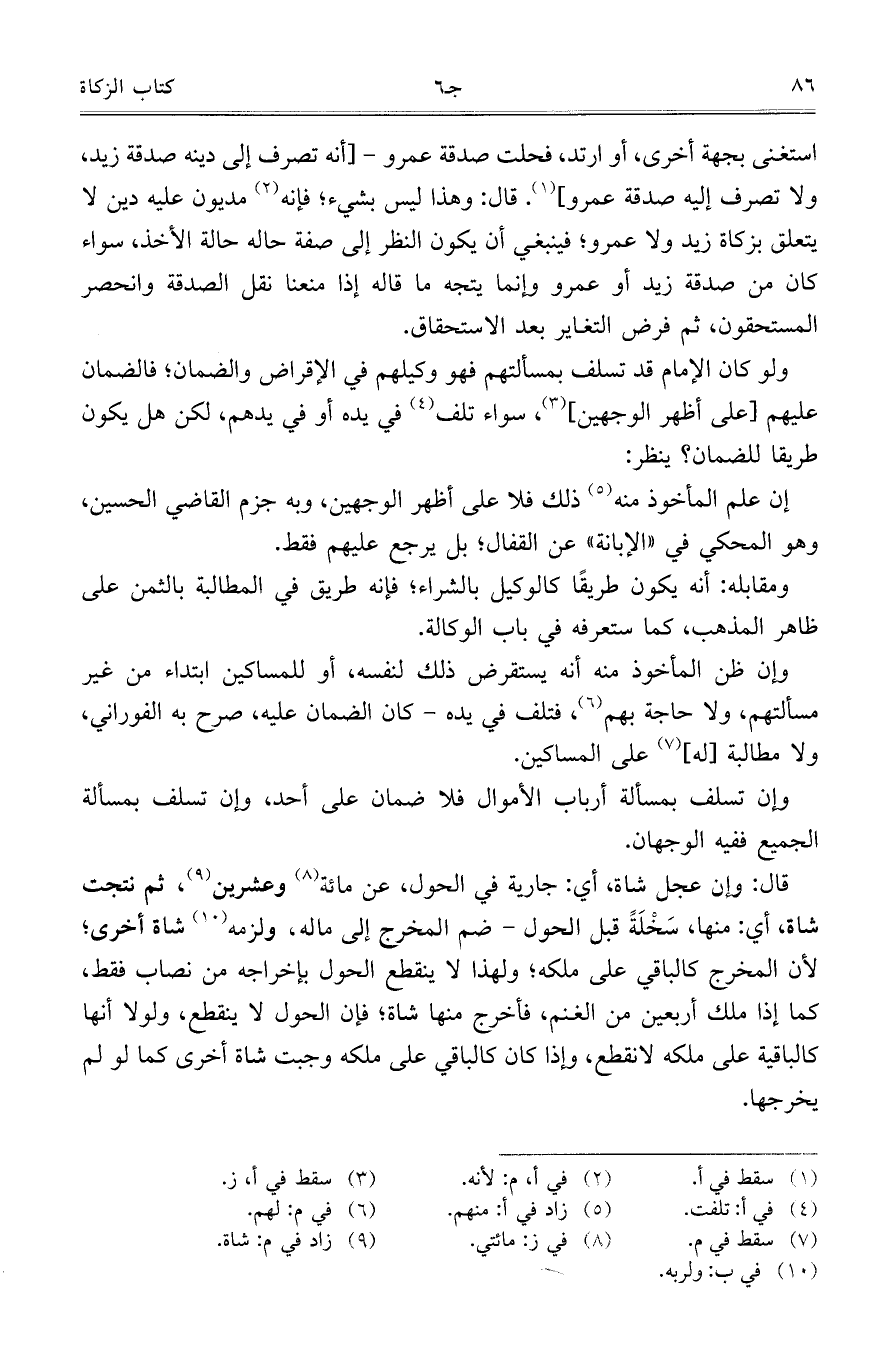 استغنى بجهة أخرى، أو ارتد، فحلت صدقة عمرو – [أنه تصرف إلى دينه صدقة زيد، ولا تصرف إليه صدقة عمرو]. قال: وهذا ليس بشيء؛ فإنه مديون عليه دين لا يتعلق بزكاة زيد ولا عمرو؛ فينبغي أن يكون النظر إلى صفة حاله حالة الأخذ، سواء كان من صدقة زيد أو عمرو وإنما يتجه ما قاله إذا منعنا نقل الصدقة وانحصر المستحقون، ثم فرض التغاير بعد الاستحقاق.