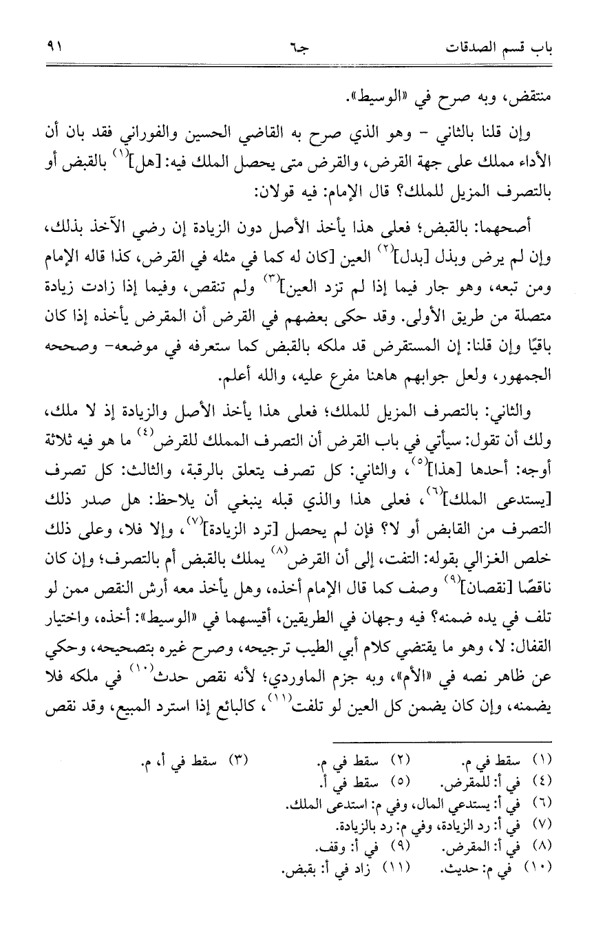 والثاني: بالتصرف المزيل للملك؛ فعلى هذا يأخذ الأصل والزيادة إذ لا ملك، ولك أن تقول: سيأتي في باب القرض أن التصرف المملك للقرض ما هو فيه ثلاثة أوجه: أحدها [هذا]، والثاني: كل تصرف يتعلق بالرقبة، والثالث: كل تصرف [يستدعي الملك]، فعلى هذا والذي قبله ينبغي أن يلاحظ: هل صدر ذلك التصرف من القابض أو لا؟ فإن لم يحصل [ترد الزيادة]، وإلا فلا، وعلى ذلك خلص الغزالي بقوله: التفت، إلى أن القرض يملك بالقبض أم بالتصرف؛ وإن كان ناقصاً [نقصان] وصف كما قال الإمام أخذه، وهل يأخذ معه أرش النقص ممن لو تلف في يده ضمنه؟ فيه وجهان في الطريقين، أقيسهما في "الوسيط": أخذه، واختيار القفال: لا، وهو ما يقتضي كلام أبي الطيب ترجيحه، وصرح غيره بتصحيحه، وحكى عن ظاهر نصه في "الأم"، وبه جزم الماوردي؛ لأنه نقص حدث في ملكه فلا يضمنه، وإن كان يضمن كل العين لو تلفت، كالبائع إذا استرد المبيع، وقد نقص
