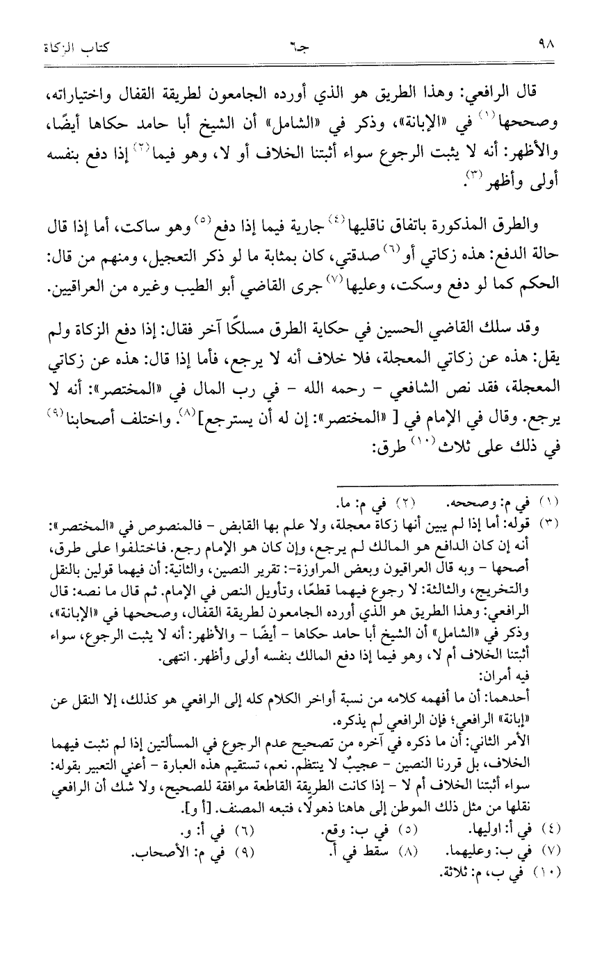 وقد سلك القاضي الحسين في حكاية الطرق مسلكاً آخر فقال: إذا دفع الزكاة ولم يقل: هذه عن زكاتي المعجلة، فلا خلاف أنه لا يرجع، فأما إذا قال: هذه عن زكاتي المعجلة، فقد نص الشافعي -رحمه الله - في رب المال في "المختصر": أنه لا يرجع. وقال في الإمام في ["المختصر": إن له أن يسترجع]. واختلف أصحابنا في ذلك على ثلاث طرق: