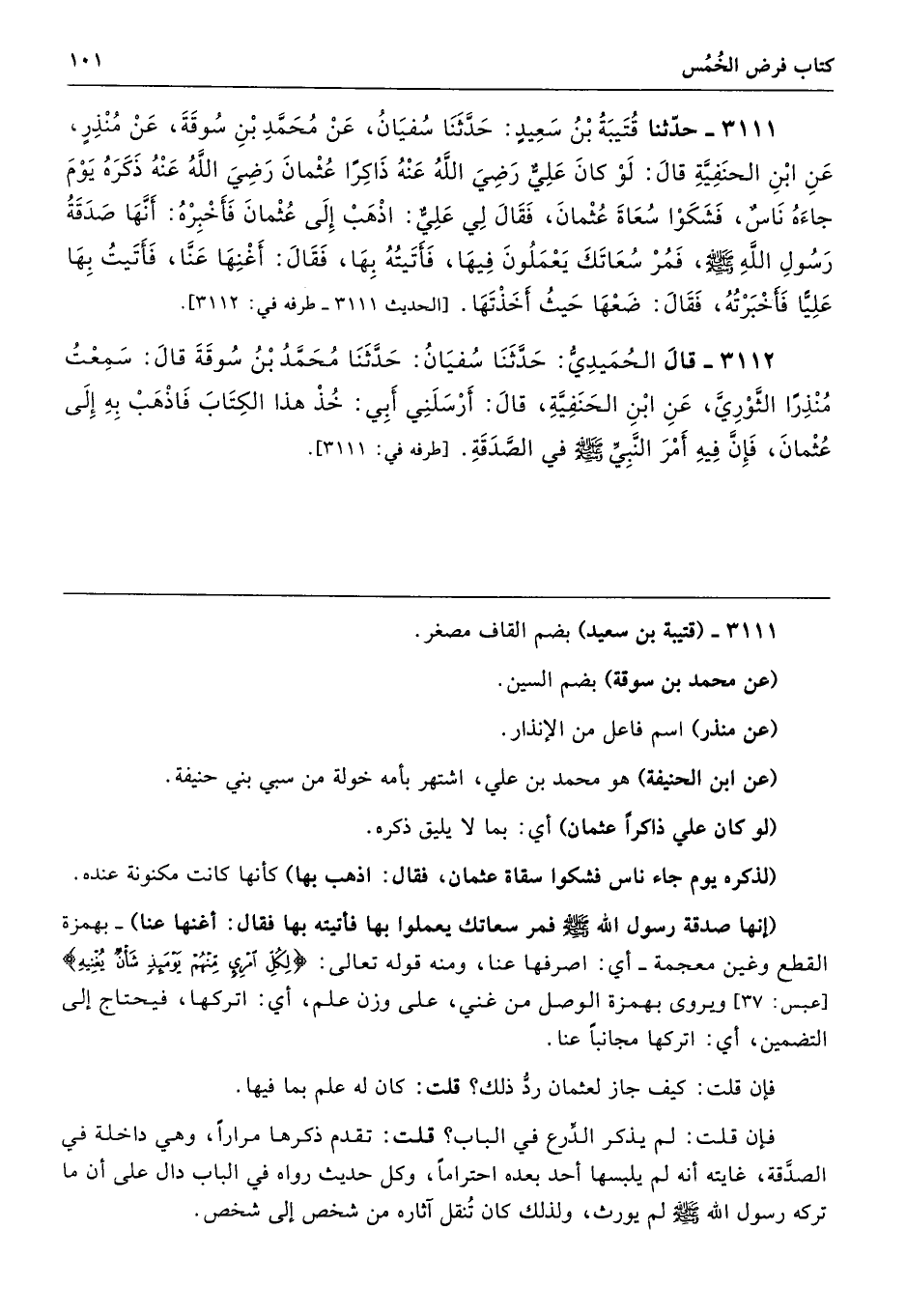 3111 - حَدَّثَنَا قُتَيْبَةُ بْنُ سَعِيدٍ حَدَّثَنَا سُفْيَانُ عَنْ مُحَمَّدِ بْنِ سُوقَةَ عَنْ مُنْذِرٍ عَنِ ابْنِ الْحَنَفِيَّةِ قَالَ لَوْ كَانَ عَلِىٌّ - رضى الله عنه - ذَاكِرًا عُثْمَانَ - رضى الله عنه - ذَكَرَهُ يَوْمَ جَاءَهُ نَاسٌ فَشَكَوْا سُعَاةَ عُثْمَانَ، فَقَالَ لِى عَلِىٌّ اذْهَبْ إِلَى عُثْمَانَ فَأَخْبِرْهُ أَنَّهَا صَدَقَةُ رَسُولِ اللَّهِ - صلى الله عليه وسلم -، فَمُرْ سُعَاتَكَ يَعْمَلُونَ فِيهَا. فَأَتَيْتُهُ بِهَا فَقَالَ أَغْنِهَا عَنَّا. فَأَتَيْتُ بِهَا عَلِيًّا فَأَخْبَرْتُهُ فَقَالَ ضَعْهَا حَيْثُ أَخَذْتَهَا.
