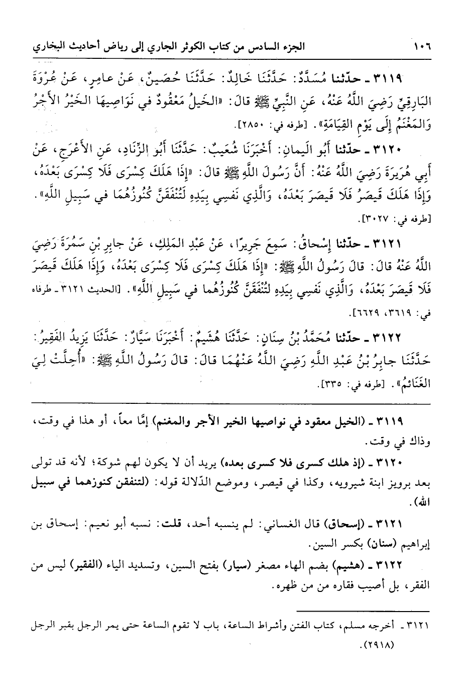 3119 - حَدَّثَنَا مُسَدَّدٌ حَدَّثَنَا خَالِدٌ حَدَّثَنَا حُصَيْنٌ عَنْ عَامِرٍ عَنْ عُرْوَةَ الْبَارِقِىِّ - رضى الله عنه - عَنِ النَّبِيِّ - صلى الله عليه وسلم - قَالَ «الْخَيْلُ مَعْقُودٌ فِي نَوَاصِيهَا الْخَيْرُ الأَجْرُ وَالْمَغْنَمُ إِلَى يَوْمِ الْقِيَامَةِ». طرفه 2850