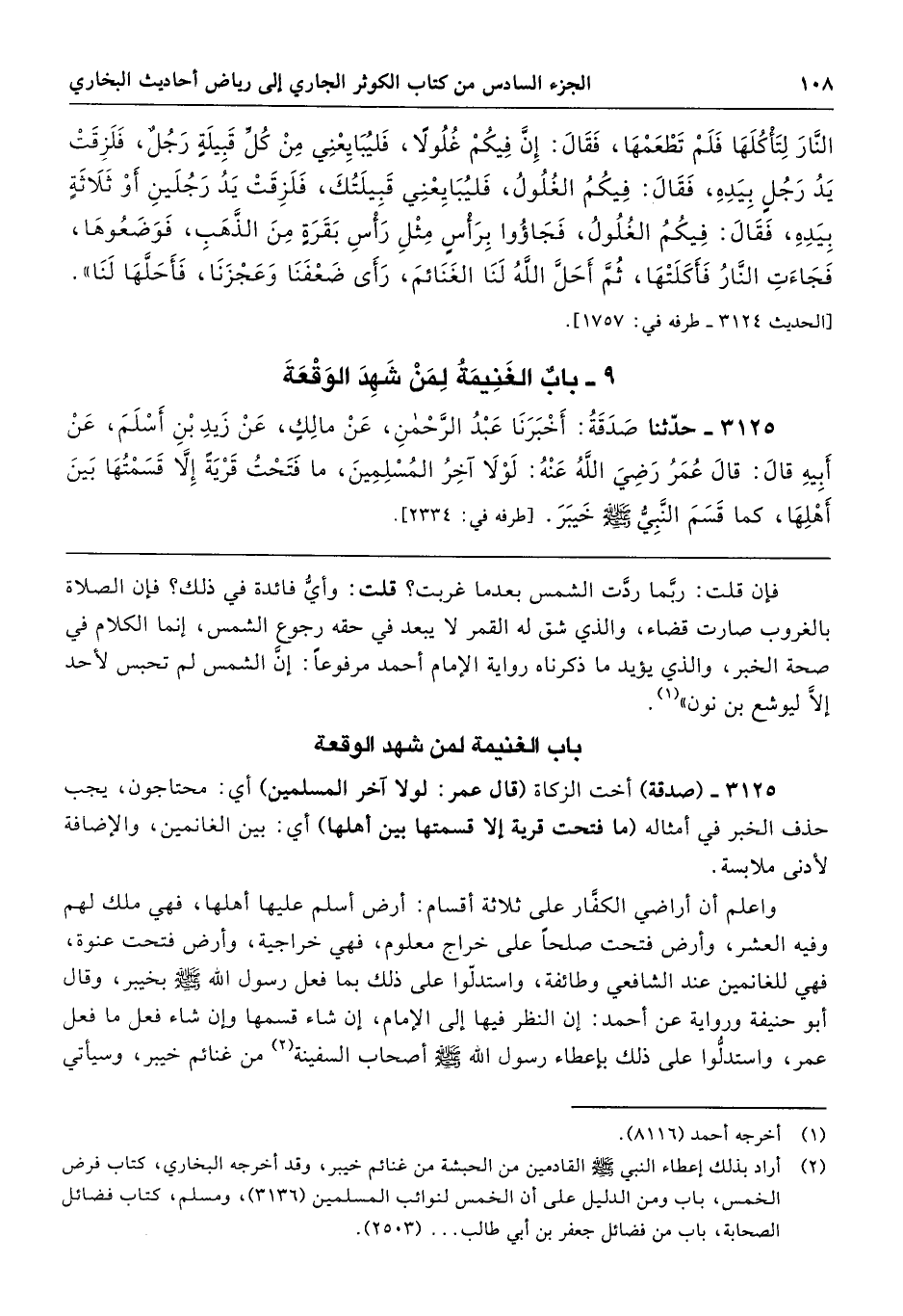 3125 - (صدقة) أخت الزكاة (قال عمر: لولا آخر المسلمين) أي: محتاجون، يجب حذف الخبر في أمثاله (ما فتحت قرية إلا قسمتها بين أهلها) أي: بين الغانمين، والإضافة لأدنى ملابسة. واعلم أن أراضي الكفار على ثلاثة أقسام: أرض أسلم عليها أهلها، فهي ملك لهم وفيه العشر، وأرض فتحت صلحًا على خراج معلوم، فهي خراجية، وأرض فتحت عنوة، فهي للغانمين عند الشافعي وطائفة، واستدلّوا على ذلك بما فعل رسول الله - صلى الله عليه وسلم - بخيبر، وقال أبو حنيفة ورواية عن أحمد: إن النظر فيها إلى الإمام، إن شاء قسمها وإن شاء فعل ما فعل عمر، واستدلُّوا على ذلك بإعطاء رسول الله - صلى الله عليه وسلم - أصحاب السفينة من غنائم خيبر، وسيأتي