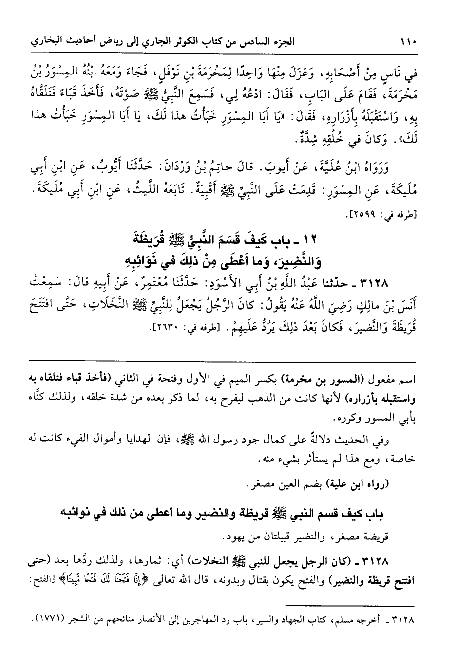 اسم مفعول (المسور بن مخرمة) بكسر الميم في الأول وفتحة في الثاني (فأخذ قباء فتلقاه به واستقبله بأزراره) لأنها كانت من الذهب ليفرح به، لما ذكر بعده من شدة خلقه، ولذلك كنَّاه بأبي المسور وكرره.