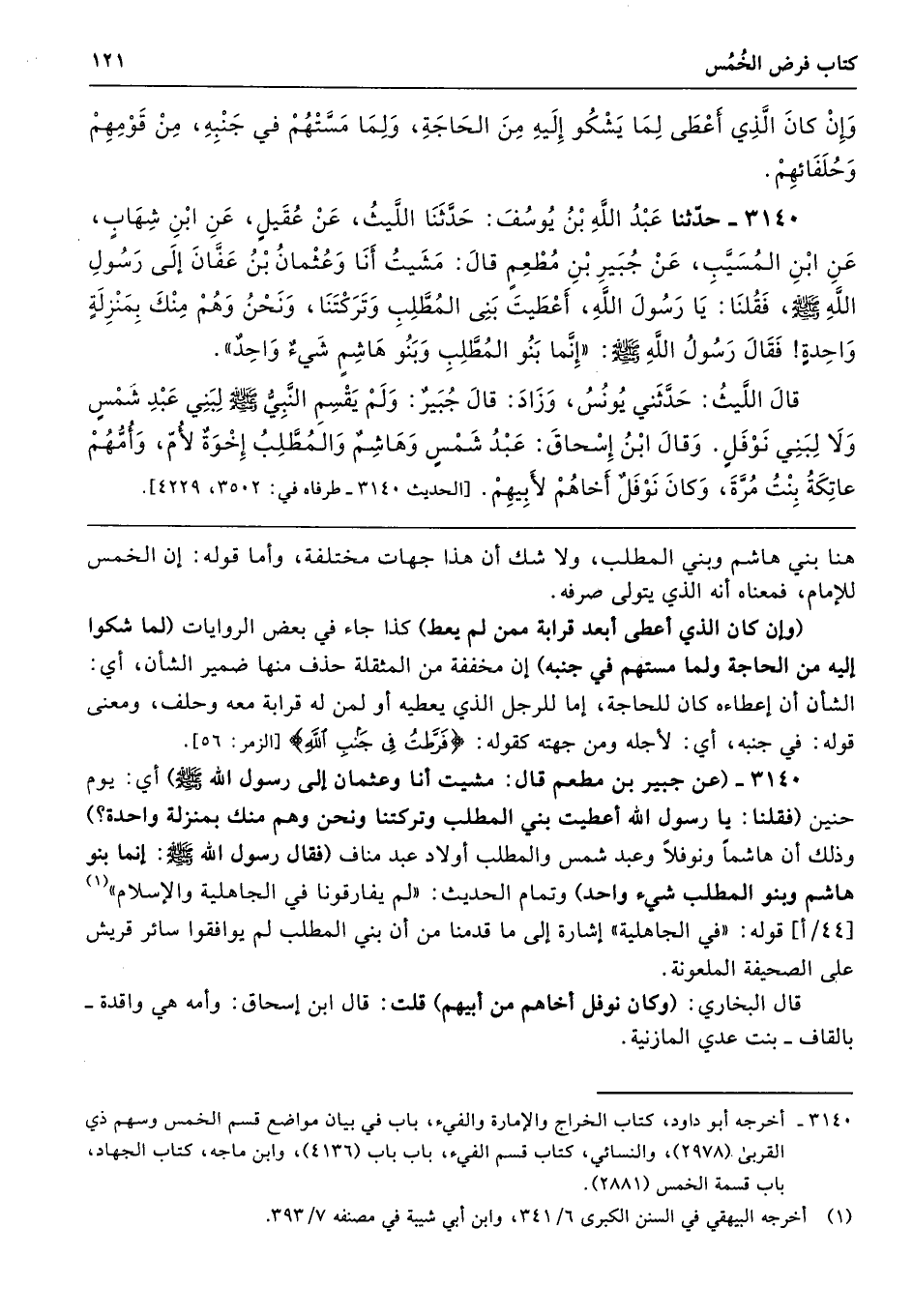 3140 - (عن جبير بن مطعم قال: مشيت أنا وعثمان إلى رسول الله - صلى الله عليه وسلم -) أي: يوم حنين (فقلنا: يا رسول الله أعطيت بني المطلب وتركتنا ونحن وهم منك بمنزلة واحدة؟) وذلك أن هاشمًا ونوفلًا وعبد شمس والمطلب أولاد عبد مناف (فقال رسول الله - صلى الله عليه وسلم -: إنما بنو هاشم وبنو المطلب شيء واحد) وتمام الحديث: "لم يفارقونا في الجاهلية والإسلام" قوله: "في الجاهلية" إشارة إلى ما قدمنا من أن بني المطلب لم يوافقوا سائر قريش على الصحيفة الملعونة.
