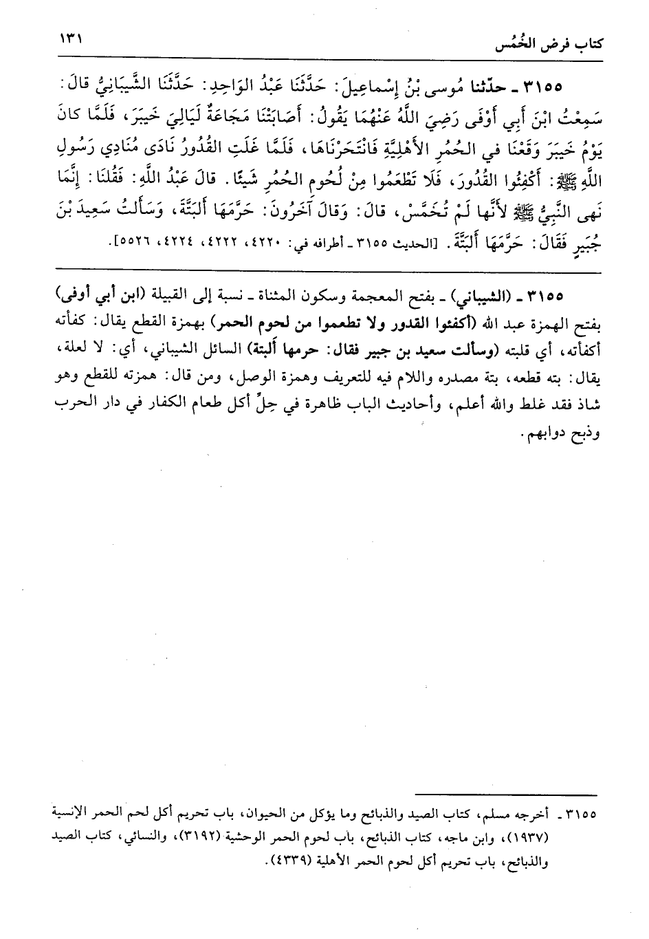 3155 - حَدَّثَنَا مُوسَى بْنُ إِسْمَاعِيلَ حَدَّثَنَا عَبْدُ الْوَاحِدِ حَدَّثَنَا الشَّيْبَانِىُّ قَالَ سَمِعْتُ ابْنَ أَبِى أَوْفَى - رضى الله عنهما - يَقُولُ أَصَابَتْنَا مَجَاعَةٌ لَيَالِىَ خَيْبَرَ، فَلَمَّا كَانَ يَوْمُ خَيْبَرَ وَقَعْنَا فِي الْحُمُرِ الأَهْلِيَّةِ، فَانْتَحَرْنَاهَا فَلَمَّا غَلَتِ الْقُدُورُ، نَادَى مُنَادِى رَسُولِ اللَّهِ - صلى الله عليه وسلم - اكْفَئُوا الْقُدُورَ، فَلاَ تَطْعَمُوا مِنْ لُحُومِ الْحُمُرِ شَيْئًا. قَالَ عَبْدُ اللَّهِ فَقُلْنَا إِنَّمَا نَهَى النَّبِىُّ - صلى الله عليه وسلم - لأَنَّهَا لَمْ تُخَمَّسْ. قَالَ وَقَالَ آخَرُونَ حَرَّمَهَا الْبَتَّةَ. وَسَأَلْتُ سَعِيدَ بْنَ جُبَيْرٍ فَقَالَ حَرَّمَهَا الْبَتَّةَ. أطرافه 4220، 4222، 4224، 5526