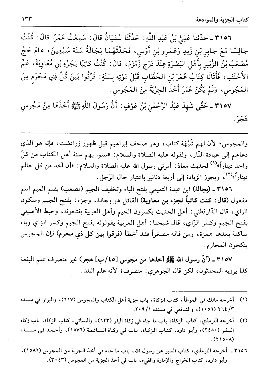 3157 - (أنّ رسول الله - صلى الله عليه وسلم - أخذها من مجوس هجر) غير منصرف علم البقعة كذا يرويه المحدثون، لكن قال الجوهري: منصرف؛ لأنه علم البلد.