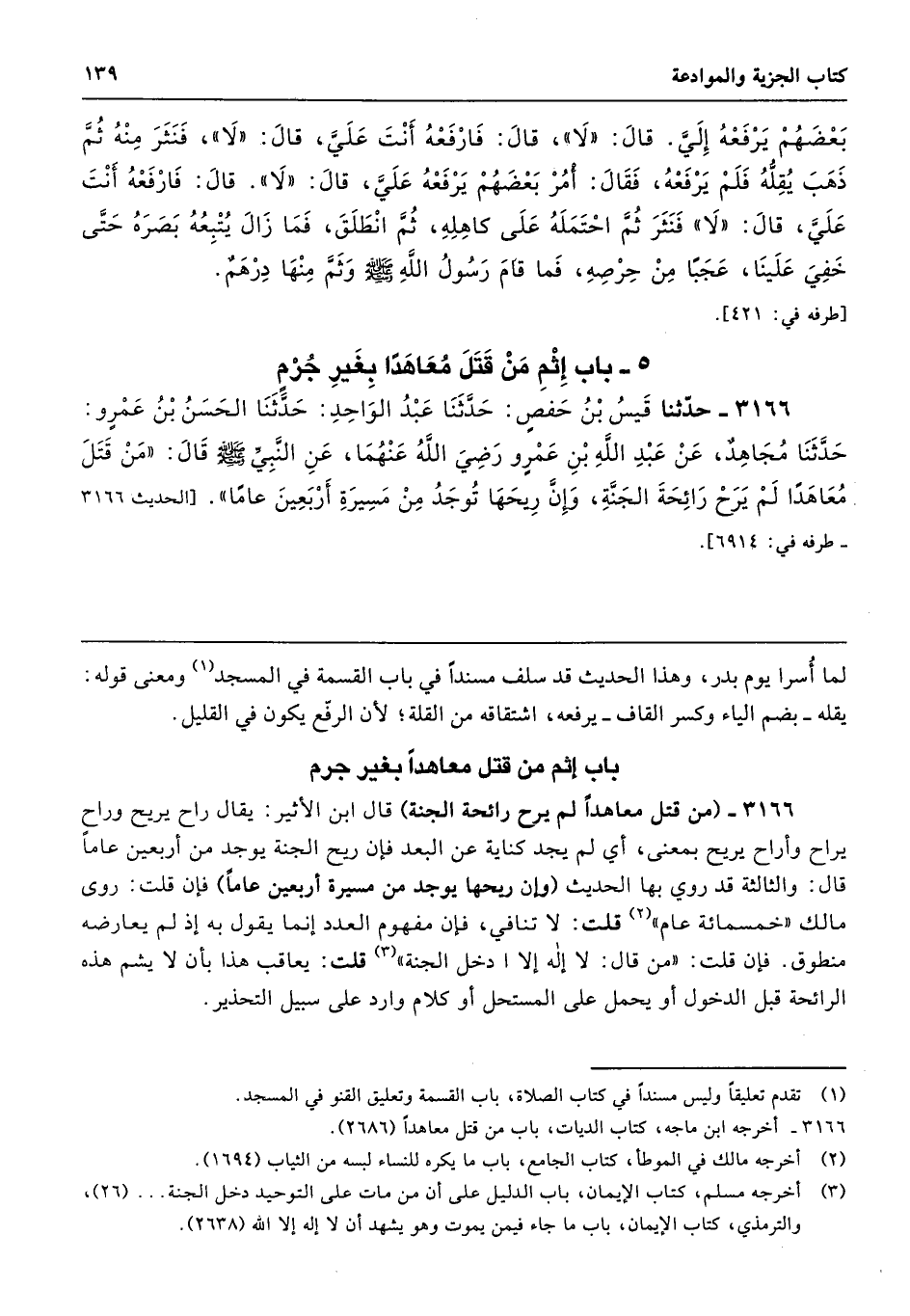 3166 - (من قتل معاهدًا لم يرح رائحة الجنة) قال ابن الأثير: يقال راح يريح وراح يراح وأراح يريح بمعنى، أي لم يجد كناية عن البعد فإن ريح الجنة يوجد من أربعين عامًا قال: والثالثة قد روي بها الحديث (وإن ريحها يوجد من مسيرة أربعين عامًا) فإن قلت: روى مالك "خمسمائة عام" قلت: لا تنافي، فإن مفهوم العدد إنما يقول به إذ لم يعارضه منطوق. فإن قلت: "من قال: لا إله إلا دخل الجنة" قلت: يعاقب هذا بأن لا يشم هذه الرائحة قبل الدخول أو يحمل على المستحل أو كلام وارد على سبيل التحذير.