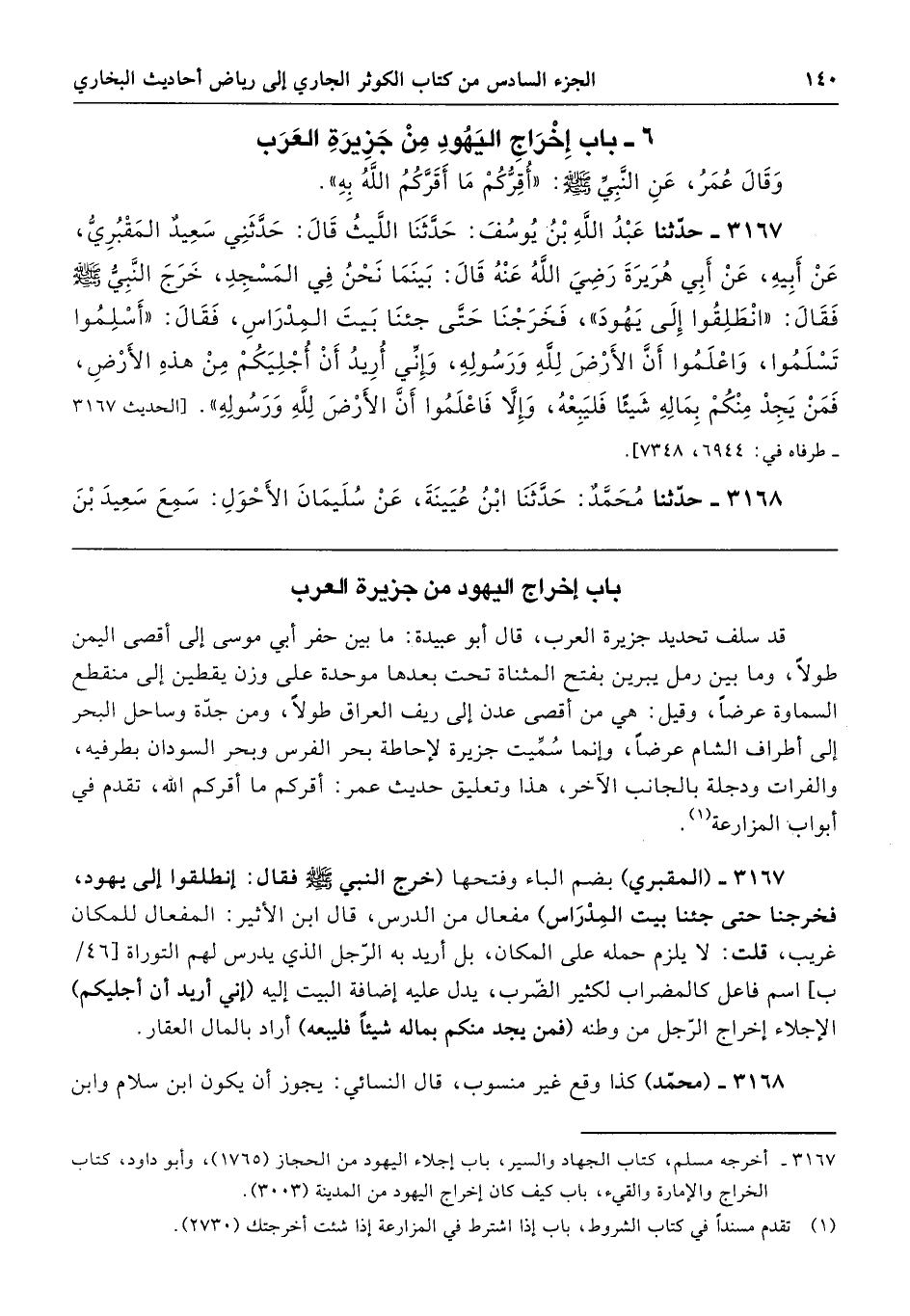 قد سلف تحديد جزيرة العرب، قال أبو عبيدة: ما بين حفر أبي موسى إلى أقصى اليمن طولًا، وما بين رمل يبرين بفتح المثناة تحت بعدها موحدة على وزن يقطين إلى منقطع السماوة عرضًا، وقيل: هي من أقصى عدن إلى ريف العراق طولًا، ومن جدّة وساحل البحر إلى أطراف الشام عرضًا، وإنما سُمِّيت جزيرة لإحاطة بحر الفرس وبحر السودان بطرفيه، والفرات ودجلة بالجانب الآخر، هذا وتعليق حديث عمر: أقركم ما أقركم الله، تقدم في أبواب المزارعة.
