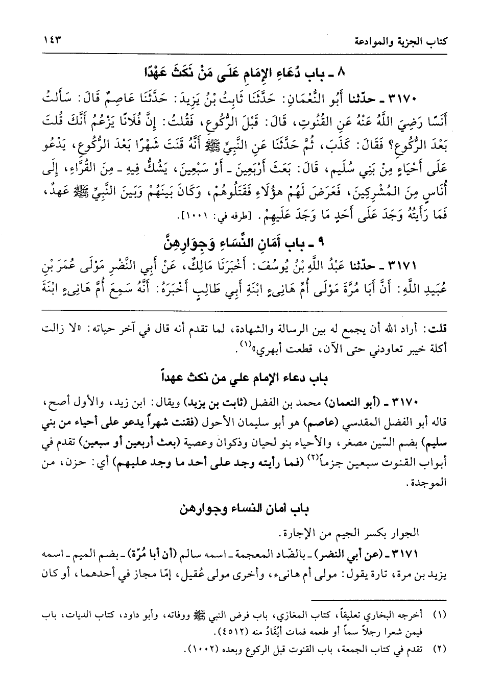 3170 - (أبو النعمان) محمد بن الفضل (ثابت بن يزيد) ويقال: ابن زيد، والأول أصح، قاله أبو الفضل المقدسي (عاصم) هو أبو سليمان الأحول (فقنت شهرًا يدعو على أحياء من بني سليم) بضم السين مصغر، والأحياء بنو لحيان وذكوان وعصية (بعث أريعين أو سبعين) تقدم في أبواب القنوت سبعين جزمًا (فما رأيته وجد على أحد ما وجد عليهم) أي: حزن، من الموجدة.