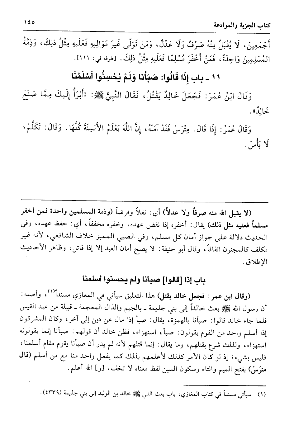 وَقَالَ ابْنُ عُمَرَ فَجَعَلَ خَالِدٌ يَقْتُلُ فَقَالَ النَّبِىُّ - صلى الله عليه وسلم - «أَبْرَأُ إِلَيْكَ مِمَّا صَنَعَ خَالِدٌ». وَقَالَ عُمَرُ إِذَا قَالَ مَتْرَسْ. فَقَدْ آمَنَهُ، إِنَّ اللَّهَ يَعْلَمُ الأَلْسِنَةَ كُلَّهَا. وَقَالَ تَكَلَّمْ لاَ بَأْسَ.