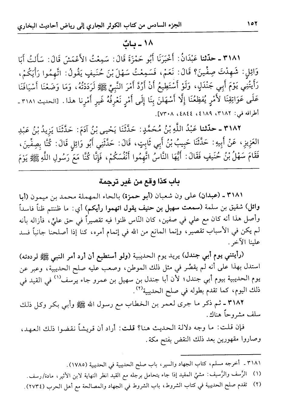 3181 - (عبدان) على وزن شعبان (أبو حمزة) بالحاء المهملة محمد بن ميمون (أبا وائل) شقيق بن سلمة (سمعت سهيل بن حنيف يقول اتهموا رأيكم) أي: ما ظننتم ظنًّا فاسدًا وأصل هذا أنه كان مع علي في صفين، كان الناس ظنوا فيه تقصيرًا في حق عليٍّ، فأزاله بأنه لم يكن في الأسباب تقصير، وإنما المانع من الله في إتمام أمره، كنا إذا أصلحنا جانبًا فسد علينا الآخر.