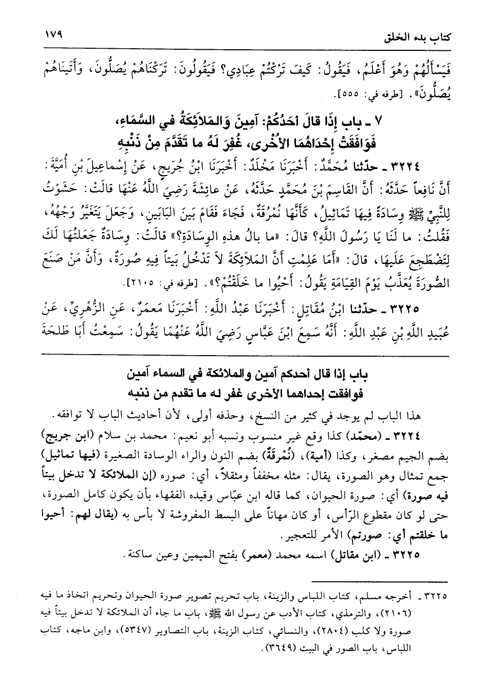 3224 - (محمّد) كذا وقع غير منسوب ونسبه أبو نعيم: محمد بن سلام (ابن جريج) بضم الجيم مصغر، وكذا (أمية)، (نُمْرقَةٌ) بضم النون والراء الوسادة الصغيرة (فيها تماثيل) جمع تمثال وهو الصورة، يقال: مثله مخففًا ومثقلًا، أي: صوره (إن الملائكة لا تدخل بيتًا فيه صورة) أي: صورة الحيوان، كما قاله ابن عبّاس وقيده الفقهاء بأن يكون كامل الصورة، حتى لو كان مقطوع الرّأس، أو كان مهانًا على البسط المفروشة لا بأس به (يقال لهم: أحيوا ما خلقتم أي: صورتم) الأمر للتعجيز.