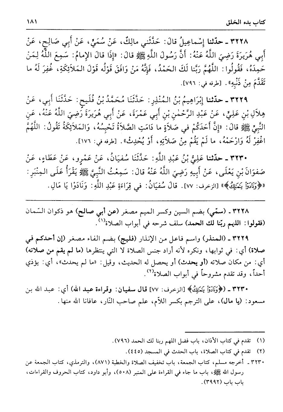 3230 - ({وَنَادَوْا يَامَالِكُ} [الزخرف: 77] قال سفيان: وقراءة عبد الله) أي: عبد الله بن مسعود: (يا مال)، على الترجم بكسر اللّام، علم صاحب النّار، عافانا الله منها.