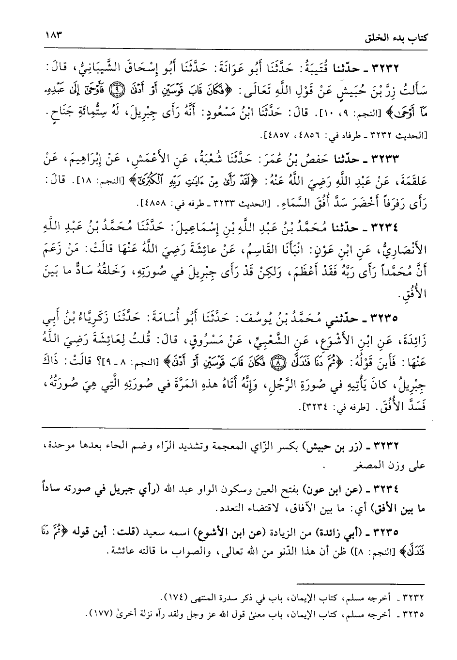 3232 - حَدَّثَنَا قُتَيْبَةُ حَدَّثَنَا أَبُو عَوَانَةَ حَدَّثَنَا أَبُو إِسْحَاقَ الشَّيْبَانِىُّ قَالَ سَأَلْتُ زِرَّ بْنَ حُبَيْشٍ عَنْ قَوْلِ اللَّهِ تَعَالَى (فَكَانَ قَابَ قَوْسَيْنِ أَوْ أَدْنَى * فَأَوْحَى إِلَى عَبْدِهِ مَا أَوْحَى). قَالَ حَدَّثَنَا ابْنُ مَسْعُودٍ أَنَّهُ رَأَى جِبْرِيلَ لَهُ سِتُّمِائَةِ جَنَاحٍ. طرفاه 4856، 4857