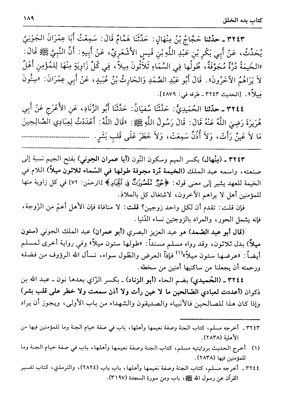 3244 - (الحُميدي) بضم الحاء (أبو الزناد) -بكسر الزّاي بعدها نون- عبد الله بن ذكوان (أعددت لعبادي الصّالحين ما لا عين رأت ولا أذن سمعت ولا خطر على قلب بشر) وإذا كان هذا للصالحين فالأنبياء والصديقون والشهداء من باب الأولى، ويجوز أن يراد