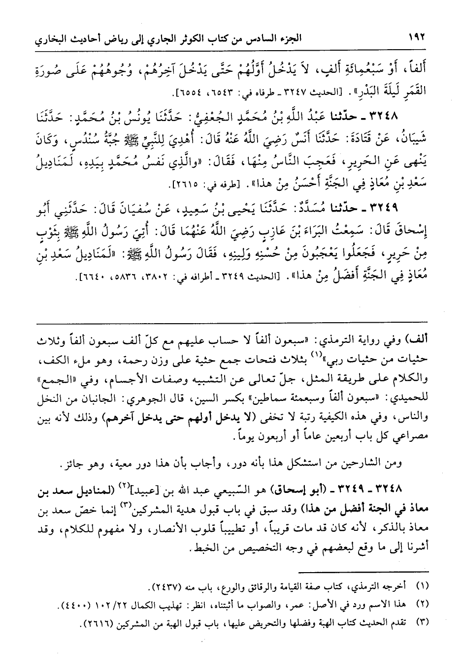 3248 - 3249 - (أبو إسحاق) هو السّبيعي عبد الله بن أعبيد، المناديل سعد بن معاذ في الجنة أفضل من هذا) وقد سبق في باب قبول هدية المشركين إنما خصّ سعد بن معاذ بالذكر، لأنه كان قد مات قريبًا، أو تطييبًا قلوب الأنصار، ولا مفهوم للكلام، وقد أشرنا إلى ما وقع لبعضهم في وجه التخصيص من الخبط.