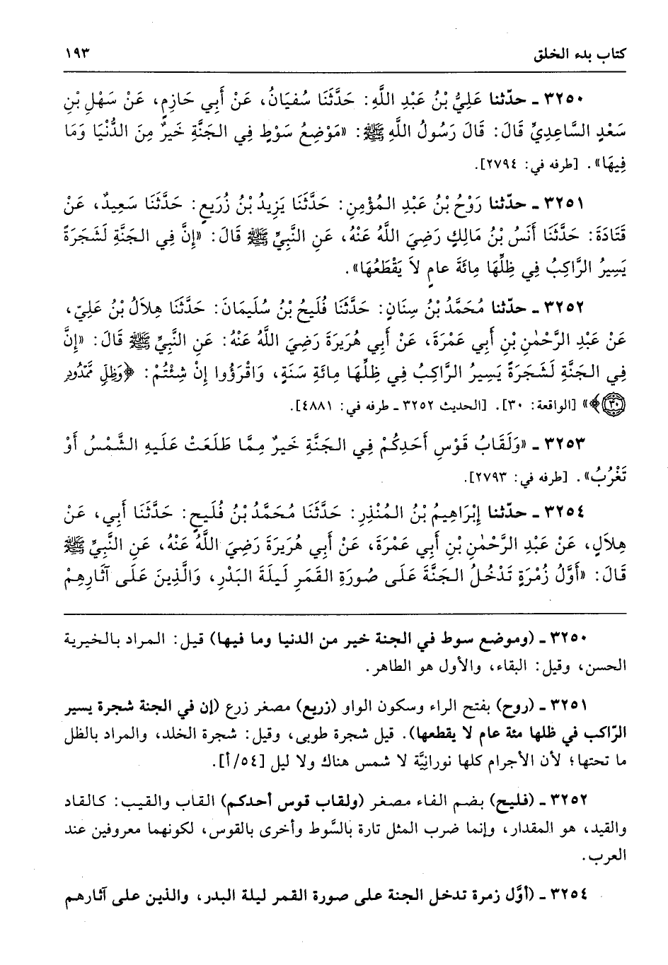 3251 - (روح) بفتح الراء وسكون الواو (زريع) مصغر زرع (إن في الجنة شجرة يسير الرّاكب في ظلها مئة عام لا يقطعها). قيل شجرة طوبى، وقيل: شجرة الخلد، والمراد بالظل ما تحتها؛ لأن الأجرام كلها نورانِيَّة لا شمس هناك ولا ليل.