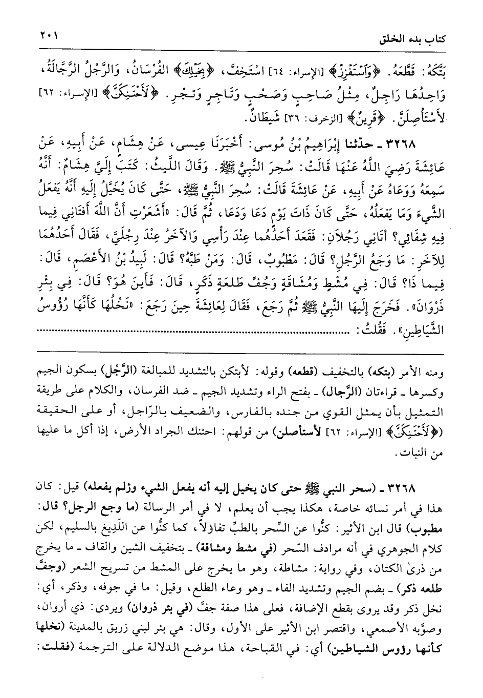 3268 - (سحر النبي - صلى الله عليه وسلم - حتى كان يخيل إليه أنه يفعل الشيء ولم يفعله) قيل: كان هذا في أمر نسائه خاصة، هكذا يجب أن يعلم، لا في أمر الرسالة (ما وجع الرجل؟ قال: مطبوب) قال ابن الأثير: كنُّوا عن السِّحر بالطبِّ تفاؤلًا، كما كنُّوا عن اللَدِيغ بالسليم، لكن كلام الجوهري في أنه مرادف السّحر (في مشط ومشاقة) -بتخفيف الشين والقاف- ما يخرج من ذرى الكتان، وفي رواية: مشاطة، وهو ما يخرج على المشط من تسريح الشعر (وجفَّ طلعه ذكر) -بضم الجيم وتشديد الفاء- وهو وعاء الطلع، وقيل: ما في جوفه، وذكر، أي: نخل ذكر وقد يروى بقطع الإضافة، فعلى هذا صفة جفَّ (في بئر ذروان) ويردى: ذي أروان، وصوَّبه الأصمعي، واقتصر ابن الأثير على الأول، وقال: هي بئر لبني زريق بالمدينة (نخلها كأنها رووس الشياطين) أي: في القباحة، هذا موضع الدلالة على الترجمة (فقلت: