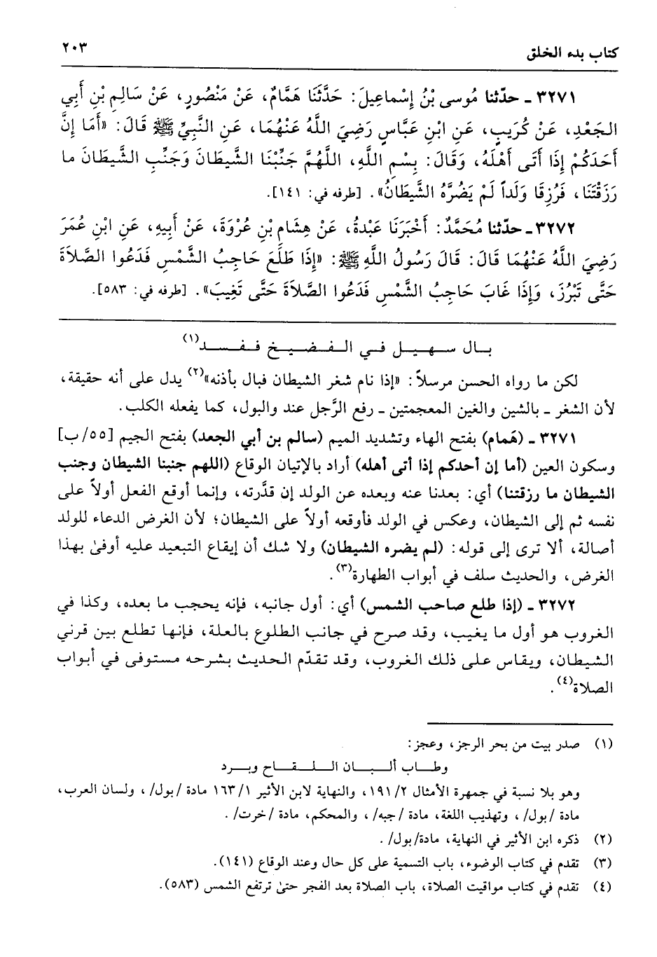 3271 - (هَمام) بفتح الهاء وتشديد الميم (سالم بن أبي الجعد) بفتح الجيم وسكون العين (أما إن أحدكم إذا أتى أهله) أراد بالإتيان الوقاع (اللهم جنبنا الشيطان وجنب الشيطان ما رزقتنا) أي: بعدنا عنه وبعده عن الولد إن قدَّرته، وإنما أوقع الفعل أولًا على نفسه ثم إلى الشيطان، وعكس في الولد فأوقعه أولًا على الشيطان: لأن الغرض الدعاء للولد أصالة، ألا ترى إلى قوله: (لم يضره الشيطان) ولا شك أن إيقاع التبعيد عليه أوفى بهذا الغرض، والحديث سلف في أبواب الطهارة.