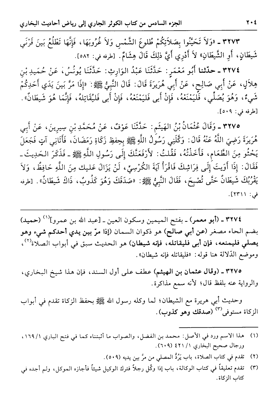 3274 - (أبو معمر) -بفتح الميمين وسكون العين-[عبد الله بن عمرو] (حميد) بضم الحاء مصغر (عن أبي صالح) هو ذكوان السمان (إذا مرّ بين يدي أحدكم شيء وهو يصلي فليمنعه، فإن أبى فليقاتله، فإنه شيطان) هو الحديث سبق في أبواب الصلاة، وموضع الدّلالة هنا قوله: "فليقاتله فإنه شيطان".