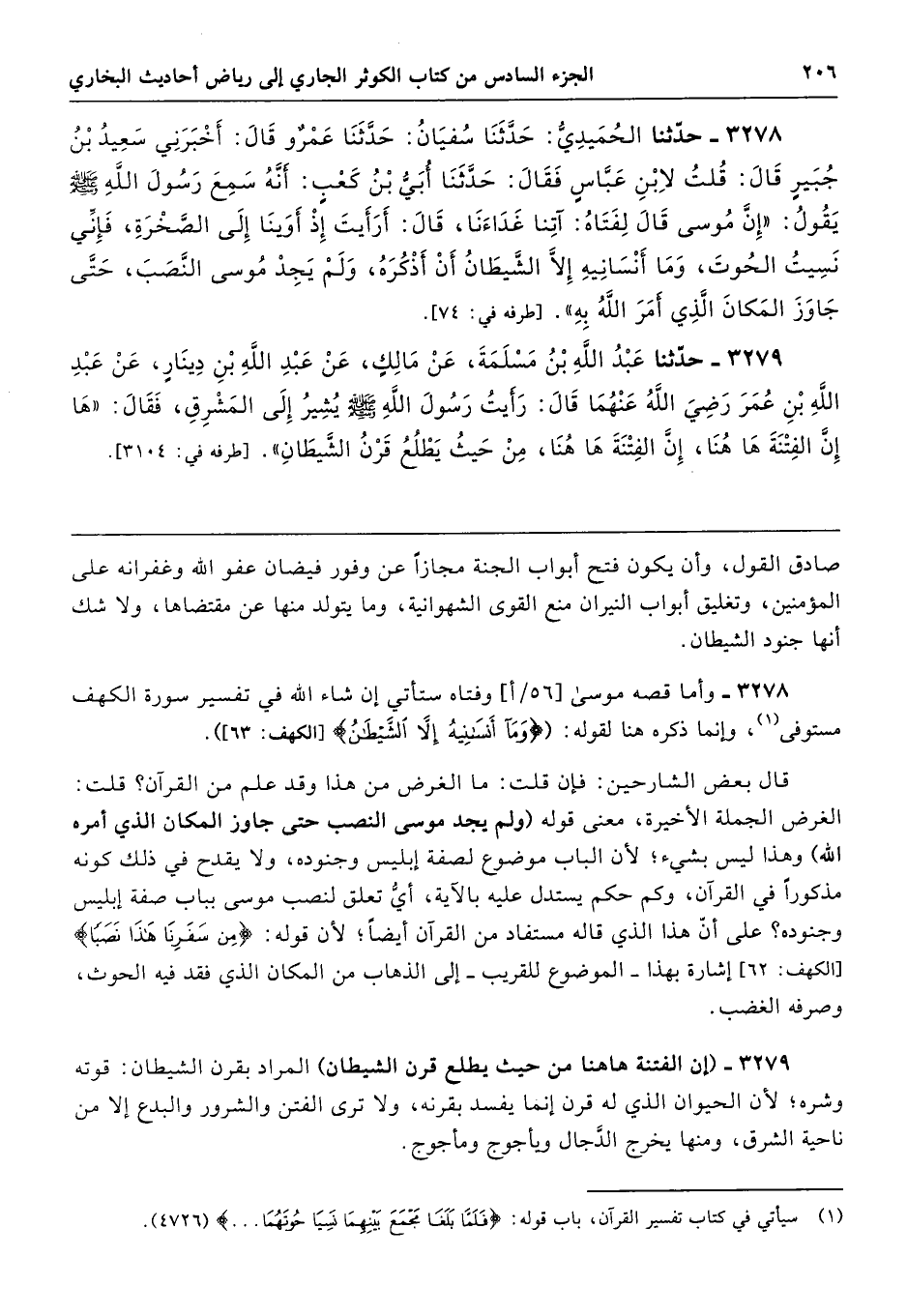 قال بعض الشارحين: فإن قلت: ما الغرض من هذا وقد علم من القرآن؟ قلت: الغرض الجملة الأخيرة، معنى قوله (ولم يجد موسى النصب حتى جاوز المكان الذي أمره الله) وهذا ليس بشيء؛ لأن الباب موضوع لصفة إبليس وجنوده، ولا يقدح في ذلك كونه مذكورًا في القرآن، وكم حكم يستدل عليه بالآية، أيُّ تعلق لنصب موسى بباب صفة إبليس وجنوده؟ على أنّ هذا الذي قاله مستفاد من القرآن أيضًا؛ لأن قوله: {مِنْ سَفَرِنَا هَذَا نَصَبًا} [الكهف: 62] إشارة بهذا -الموضوع للقريب- إلى الذهاب من المكان الذي فقد فيه الحوت، وصرفه الغضب.