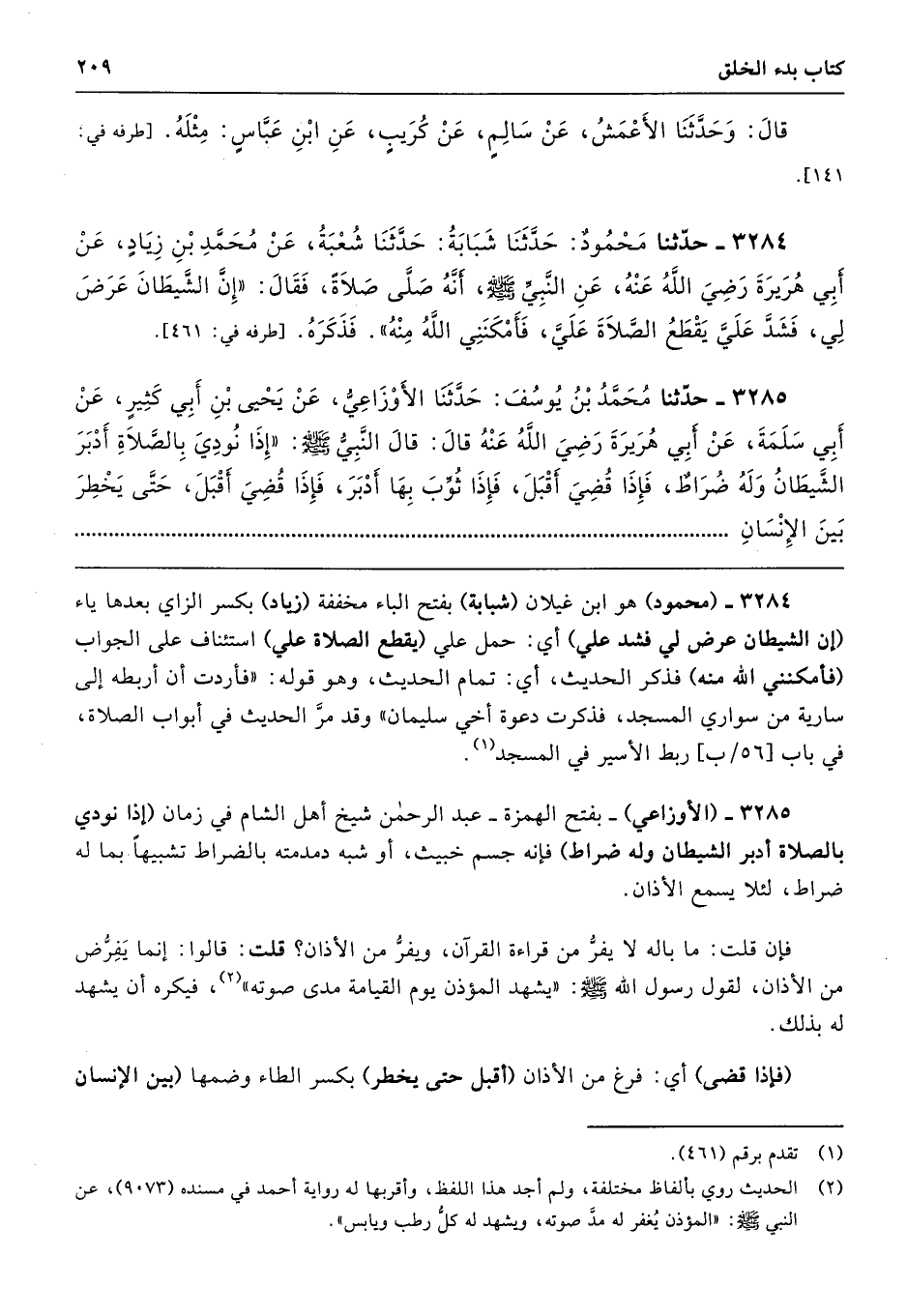 3285 - حَدَّثَنَا مُحَمَّدُ بْنُ يُوسُفَ حَدَّثَنَا الأَوْزَاعِىُّ عَنْ يَحْيَى بْنِ أَبِى كَثِيرٍ عَنْ أَبِى سَلَمَةَ عَنْ أَبِى هُرَيْرَةَ - رضى الله عنه - قَالَ قَالَ النَّبِىُّ - صلى الله عليه وسلم - «إِذَا نُودِىَ بِالصَّلاَةِ أَدْبَرَ الشَّيْطَانُ وَلَهُ ضُرَاطٌ، فَإِذَا قُضِىَ أَقْبَلَ، فَإِذَا ثُوِّبَ بِهَا أَدْبَرَ، فَإِذَا قُضِىَ أَقْبَلَ، حَتَّى يَخْطِرَ بَيْنَ الإِنْسَانِ