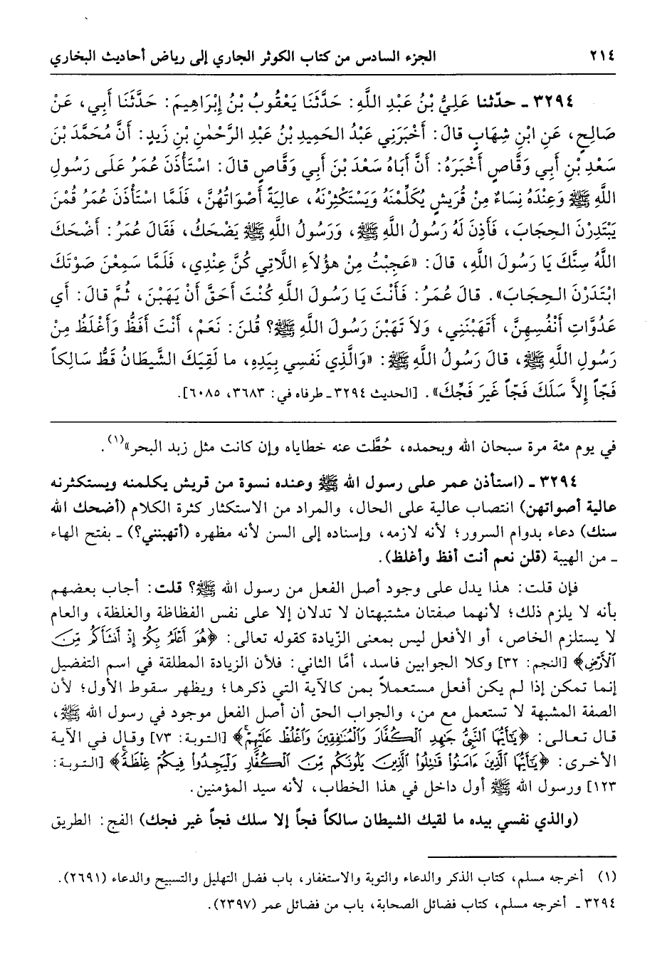 3294 - حَدَّثَنَا عَلِىُّ بْنُ عَبْدِ اللَّهِ حَدَّثَنَا يَعْقُوبُ بْنُ إِبْرَاهِيمَ حَدَّثَنَا أَبِى عَنْ صَالِحٍ عَنِ ابْنِ شِهَابٍ قَالَ أَخْبَرَنِى عَبْدُ الْحَمِيدِ بْنُ عَبْدِ الرَّحْمَنِ بْنِ زَيْدٍ أَنَّ مُحَمَّدَ بْنَ سَعْدِ بْنِ أَبِى وَقَّاصٍ أَخْبَرَهُ أَنَّ أَبَاهُ سَعْدَ بْنَ أَبِى وَقَّاصٍ قَالَ اسْتَأْذَنَ عُمَرُ عَلَى رَسُولِ اللَّهِ - صلى الله عليه وسلم -، وَعِنْدَهُ نِسَاءٌ مِنْ قُرَيْشٍ يُكَلِّمْنَهُ وَيَسْتَكْثِرْنَهُ، عَالِيَةً أَصْوَاتُهُنَّ، فَلَمَّا اسْتَأْذَنَ عُمَرُ، قُمْنَ يَبْتَدِرْنَ الْحِجَابَ، فَأَذِنَ لَهُ رَسُولُ اللَّهِ - صلى الله عليه وسلم -، وَرَسُولُ اللَّهِ - صلى الله عليه وسلم - يَضْحَكُ، فَقَالَ عُمَرُ أَضْحَكَ اللَّهُ سِنَّكَ يَا رَسُولَ اللَّهِ. قَالَ «عَجِبْتُ مِنْ هَؤُلاَءِ اللاَّتِى كُنَّ عِنْدِى، فَلَمَّا سَمِعْنَ صَوْتَكَ ابْتَدَرْنَ الْحِجَابَ». قَالَ عُمَرُ فَأَنْتَ يَا رَسُولَ اللَّهِ كُنْتَ أَحَقَّ أَنْ يَهَبْنَ. ثُمَّ قَالَ أَىْ عَدُوَّاتِ أَنْفُسِهِنَّ، أَتَهَبْنَنِى وَلاَ تَهَبْنَ رَسُولَ اللَّهِ - صلى الله عليه وسلم - قُلْنَ نَعَمْ، أَنْتَ أَفَظُّ وَأَغْلَظُ مِنْ رَسُولِ اللَّهِ - صلى الله عليه وسلم -. قَالَ رَسُولُ اللَّهِ - صلى الله عليه وسلم - «وَالَّذِى نَفْسِى بِيَدِهِ مَا لَقِيَكَ الشَّيْطَانُ قَطُّ سَالِكًا فَجًّا إِلاَّ سَلَكَ فَجًّا غَيْرَ فَجِّكَ». طرفاه 3683، 6085