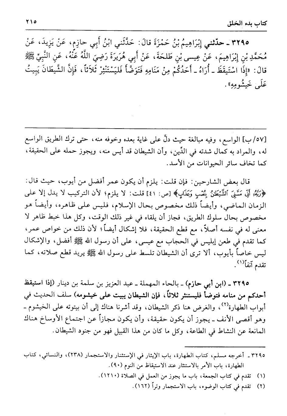 3295 - (أبن أبي حازم) -بالحاء المهملة- عبد العزيز بن سلمة بن دينار (إذا استيقظ أحدكم من منامه فتوضأ فليستنثر ثلاثًا، فإن الشيطان يبيت على خيشومه) سلف الحديث في أبواب الطهارة، والغرض هنا ذكر الشيطان، وقد أشرنا هناك إلى أن بيتوته على الخيشوم -وهو أقصى الأنف- يجوز أن يكون حقيقة، وأن يكون مجازًا عن اجتماع الأوساخ هناك المانعة عن النشاط في الطاعة، وكل ما كان من هذا القبيل فهو من جنود الشيطان.