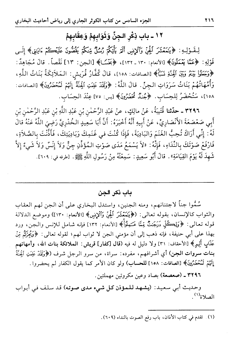 3296 - حَدَّثَنَا قُتَيْبَةُ عَنْ مَالِكٍ عَنْ عَبْدِ الرَّحْمَنِ بْنِ عَبْدِ اللَّهِ بْنِ عَبْدِ الرَّحْمَنِ بْنِ أَبِى صَعْصَعَةَ الأَنْصَارِىِّ عَنْ أَبِيهِ أَنَّهُ أَخْبَرَهُ أَنَّ أَبَا سَعِيدٍ الْخُدْرِىَّ - رضى الله عنه - قَالَ لَهُ «إِنِّى أَرَاكَ تُحِبُّ الْغَنَمَ وَالْبَادِيَةَ، فَإِذَا كُنْتَ فِي غَنَمِكَ وَبَادِيَتِكَ فَأَذَّنْتَ بِالصَّلاَةِ، فَارْفَعْ صَوْتَكَ بِالنِّدَاءِ، فَإِنَّهُ لاَ يَسْمَعُ مَدَى صَوْتِ الْمُؤَذِّنِ جِنٌّ وَلاَ إِنْسٌ وَلاَ شَىْءٌ إِلاَّ شَهِدَ لَهُ يَوْمَ الْقِيَامَةِ». قَالَ أَبُو سَعِيدٍ سَمِعْتُهُ مِنْ رَسُولِ اللَّهِ - صلى الله عليه وسلم -. طرفه 609