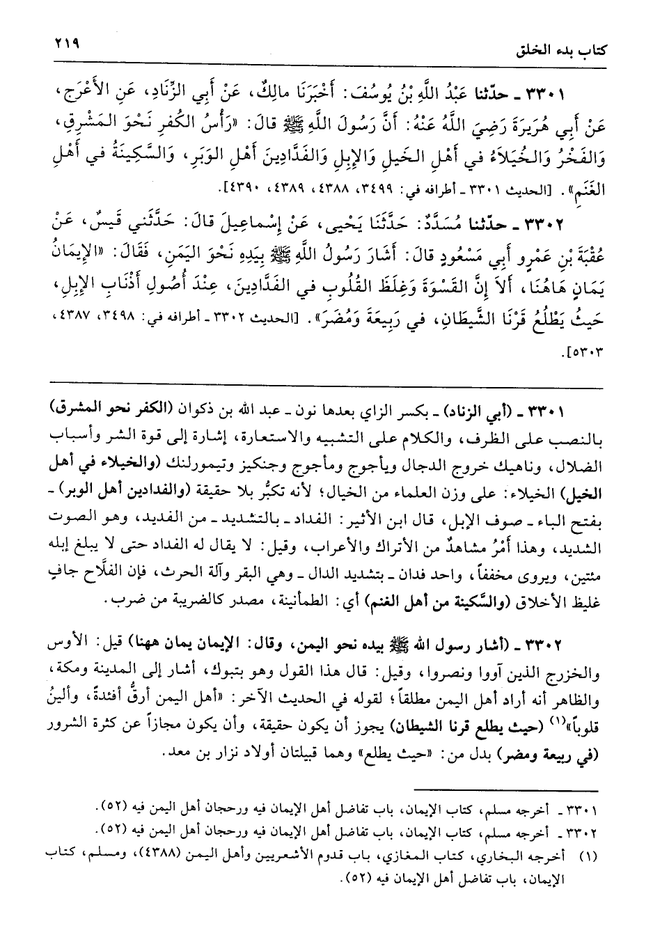 3301 - (أبي الزناد) -بكسر الزاي بعدها نون- عبد الله بن ذكوان (الكفر نحو المشرق) بالنصب على الظرف، والكلام على التشبيه والاستعارة، إشارة إلى قوة الشر وأسباب الضلال، وناهيك خروج الدجال ويأجوج ومأجوج وجنكيز وتيمورلنك (والخيلاء في أهل الخيل) الخيلاء: على وزن العلماء من الخيال؛ لأنه تكبُّر بلا حقيقة (والفدادين أهل الوبر) -بفتح الباء- صوف الإبل، قال ابن الأثير: الفداد -بالتشديد- من الفديد، وهو الصوت الشديد، وهذا أَمْرُ مشاهدٌ من الأتراك والأعراب، وقيل: لا يقال له الفداد حتى لا يبلغ إبله مئتين، ويروى مخففًا، واحد فدان -بتشديد الدال- وهي البقر وآلة الحرث، فإن الفلَّاح جافٍ غليظ الأخلاق (والسَّكينة من أهل الغنم) أي: الطمأنينة، مصدر كالضريبة من ضرب.