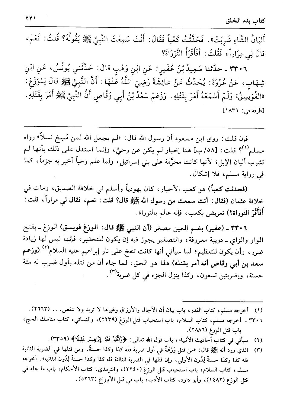 3306 - (عفير) بضم العين مصغر (أن النبي - صلى الله عليه وسلم - قال: الوزغ فويسق) الوزغ -بفتح الواو والزاي- دويبة معروفة، والتصغير يجوز فيه إن يكون للتحقير، فإنها ليس لها زيادة ضرر، وأن يكون للتعظيم؛ لما سيأتي أنها كانت تنفخ على نار إبراهيم عليه السلام (وزعم سعد بن أبي وقاص أنه أمر بقتله) هذا هو الحق، لما جاء أن من قتله بأول ضرب له مئة حسنة، وبضربتين تسعون، وكذا ينزل الجزء في كل ضربة.