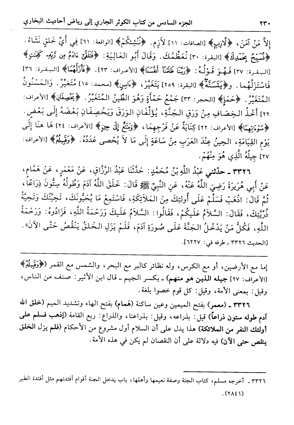 3326 - (معمر) بفتح الميمين وعين ساكنة (هَمام) بفتح الهاء وتشديد الميم (خلق الله آدم طوله ستون ذراعًا) قيل: بذراعه، وقيل: بذراعنا، والذراع: ربع القامة (إذهب فسلم على أولئك النفر من الملائكة) هذا يدل على أن السلام أول مشروع من الأحكام (فلم يزل الخلق ينقص حتى الآن) فيه دلالة على أن النقصان لم يكن في هذه الأمة.
