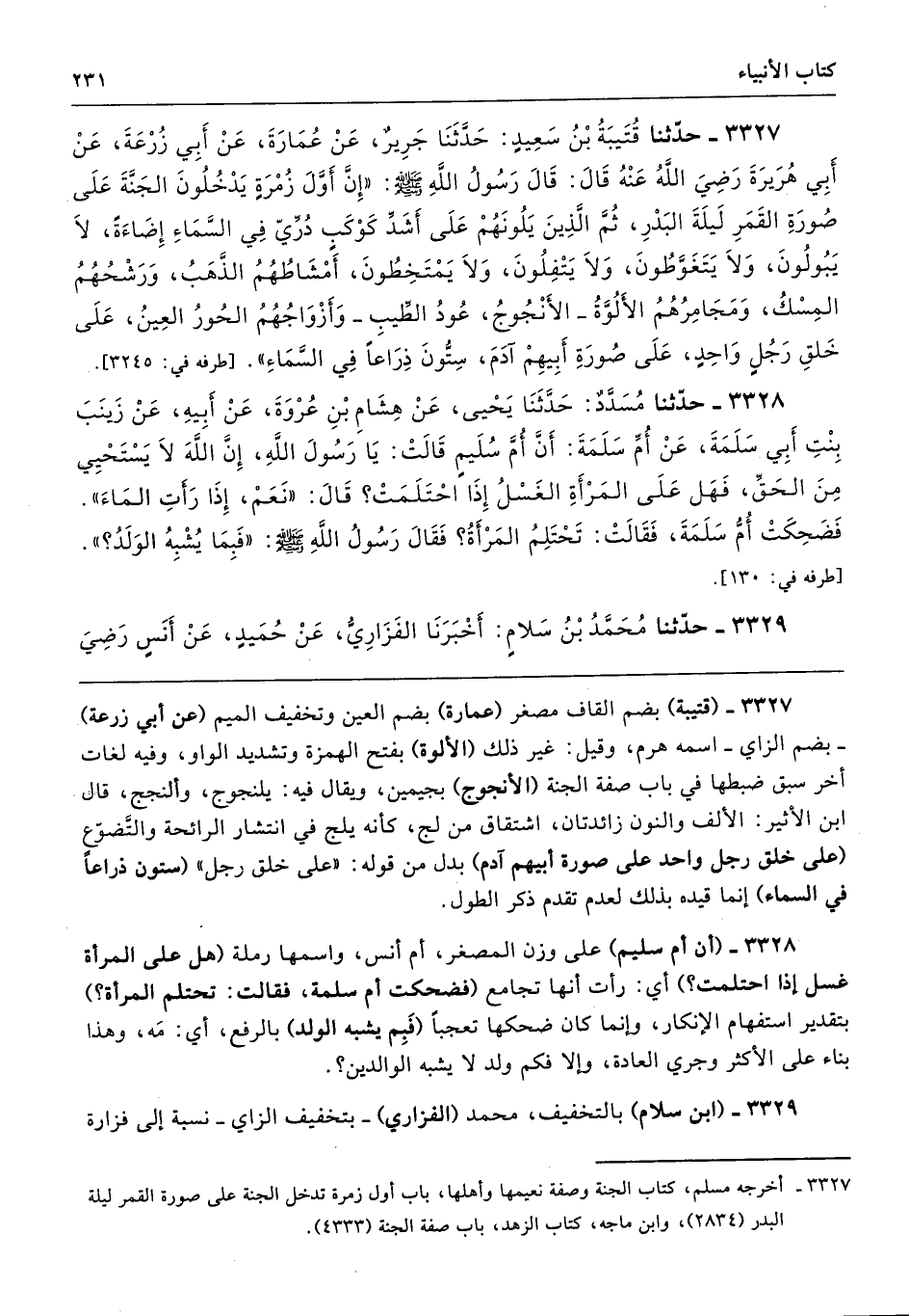 3327 - (قتيبة) بضم القاف مصغر (عمارة) بضم العين وتخفيف الميم (عن أبي زرعة) -بضم الزاي- اسمه هرم، وقيل: غير ذلك (الألوة) بفتح الهمزة وتشديد الواو، وفيه لغات أخر سبق ضبطها في باب صفة الجنة (الأنجوج) بجيمين، ويقال فيه: يلنجوج، وألنجج، قال ابن الأثير: الألف والنون زائدتان، اشتقاق من لج، كأنه يلج في انتشار الرائحة والتَّضوّع (على خلق رجل واحد على صورة أبيهم آدم) بدل من قوله: "على خلق رجل" (ستون ذراعًا في السماء) إنما قيده بذلك لعدم تقدم ذكر الطول.