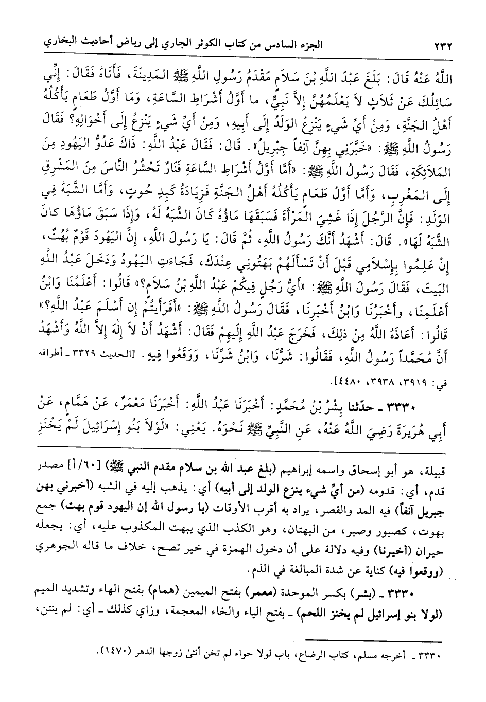 3330 - (بشر) بكسر الموحدة (معمر) بفتح الميمين (همام) بفتح الهاء وتشديد الميم (لولا بنو إسرائيل لم يخنز اللحم) -بفتح الياء والخاء المعجمة، وزاي كذلك- أي: لم ينتن،