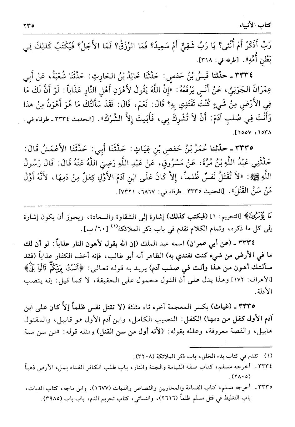 3335 - حَدَّثَنَا عُمَرُ بْنُ حَفْصِ بْنِ غِيَاثٍ حَدَّثَنَا أَبِى حَدَّثَنَا الأَعْمَشُ قَالَ حَدَّثَنِى عَبْدُ اللَّهِ بْنُ مُرَّةَ عَنْ مَسْرُوقٍ عَنْ عَبْدِ اللَّهِ - رضى الله عنه - قَالَ قَالَ رَسُولُ اللَّهِ - صلى الله عليه وسلم - «لاَ تُقْتَلُ نَفْسٌ ظُلْمًا إِلاَّ كَانَ عَلَى ابْنِ آدَمَ الأَوَّلِ كِفْلٌ مِنْ دَمِهَا، لأَنَّهُ أَوَّلُ مَنْ سَنَّ الْقَتْلَ». طرفاه 6867، 7321