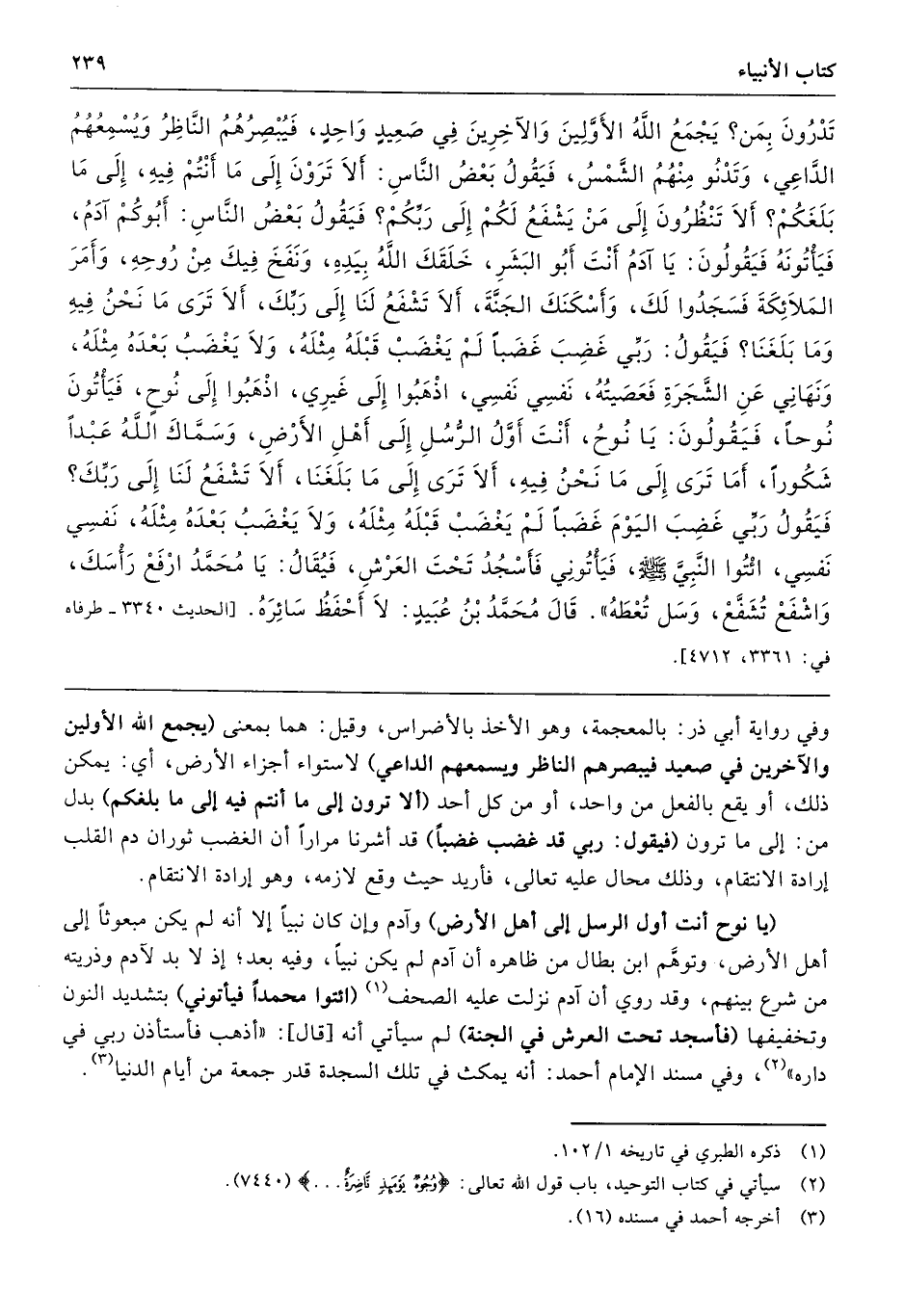 تَدْرُونَ بِمَنْ يَجْمَعُ اللَّهُ الأَوَّلِينَ وَالآخِرِينَ فِي صَعِيدٍ وَاحِدٍ فَيُبْصِرُهُمُ النَّاظِرُ وَيُسْمِعُهُمُ الدَّاعِى، وَتَدْنُو مِنْهُمُ الشَّمْسُ، فَيَقُولُ بَعْضُ النَّاسِ أَلاَ تَرَوْنَ إِلَى مَا أَنْتُمْ فِيهِ، إِلَى مَا بَلَغَكُمْ، أَلاَ تَنْظُرُونَ إِلَى مَنْ يَشْفَعُ لَكُمْ إِلَى رَبِّكُمْ فَيَقُولُ بَعْضُ النَّاسِ أَبُوكُمْ آدَمُ، فَيَأْتُونَهُ فَيَقُولُونَ يَا آدَمُ أَنْتَ أَبُو الْبَشَرِ، خَلَقَكَ اللَّهُ بِيَدِهِ وَنَفَخَ فِيكَ مِنْ رُوحِهِ، وَأَمَرَ الْمَلاَئِكَةَ فَسَجَدُوا لَكَ، وَأَسْكَنَكَ الْجَنَّةَ، أَلاَ تَشْفَعُ لَنَا إِلَى رَبِّكَ أَلاَ تَرَى مَا نَحْنُ فِيهِ وَمَا بَلَغَنَا فَيَقُولُ رَبِّى غَضِبَ غَضَبًا لَمْ يَغْضَبْ قَبْلَهُ مِثْلَهُ، وَلاَ يَغْضَبُ بَعْدَهُ مِثْلَهُ، وَنَهَانِى عَنِ الشَّجَرَةِ فَعَصَيْتُهُ، نَفْسِى نَفْسِى، اذْهَبُوا إِلَى غَيْرِى، اذْهَبُوا إِلَى نُوحٍ. فَيَأْتُونَ نُوحًا فَيَقُولُونَ يَا نُوحُ أَنْتَ أَوَّلُ الرُّسُلِ إِلَى أَهْلِ الأَرْضِ، وَسَمَّاكَ اللَّهُ عَبْدًا شَكُورًا، أَمَا تَرَى إِلَى مَا نَحْنُ فِيهِ أَلاَ تَرَى إِلَى مَا بَلَغَنَا أَلاَ تَشْفَعُ لَنَا إِلَى رَبِّكَ فَيَقُولُ رَبِّى غَضِبَ الْيَوْمَ غَضَبًا لَمْ يَغْضَبْ قَبْلَهُ مِثْلَهُ، وَلاَ يَغْضَبُ بَعْدَهُ مِثْلَهُ، نَفْسِى نَفْسِى، ائْتُوا النَّبِىَّ - صلى الله عليه وسلم -، فَيَأْتُونِى، فَأَسْجُدُ تَحْتَ الْعَرْشِ فَيُقَالُ يَا مُحَمَّدُ ارْفَعْ رَأْسَكَ وَاشْفَعْ تُشَفَّعْ، وَسَلْ تُعْطَهُ». قَالَ مُحَمَّدُ بْنُ عُبَيْدٍ لاَ أَحْفَظُ سَائِرَهُ. طرفاه 3361، 4712